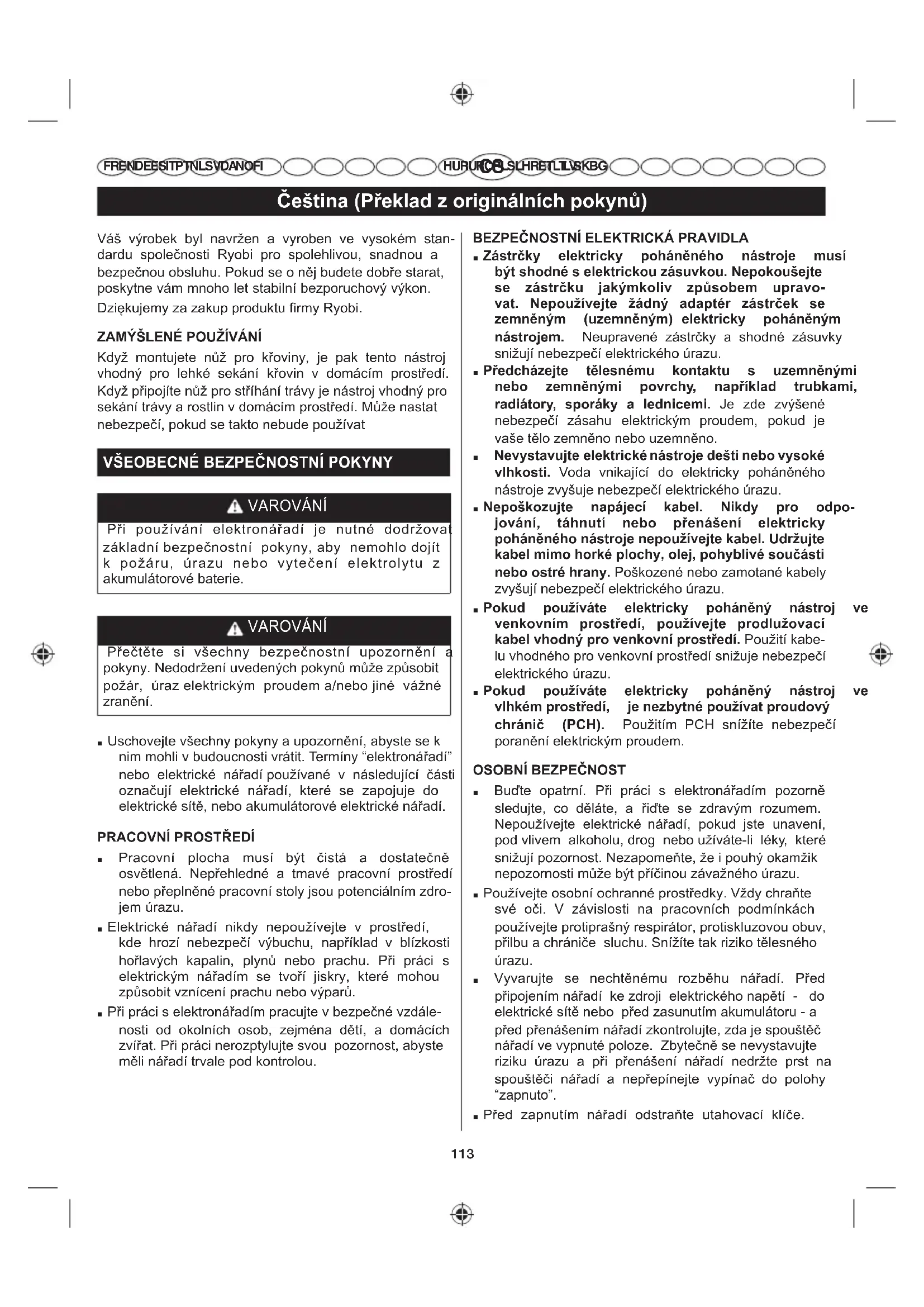 HU RU RO PL SL HR ET LT LV SK BG Váš výrobek byl navržen a vyroben ve vysokém stan- dardu společnosti Ryobi pro spolehlivou, snadnou a bezpečnou obsluhu. Pokud se o něj budete dobře starat, poskytne vám mnoho let stabilní bezporuchový výkon. Dziękujemy za zakup produktu firmy Ryobi. =$0éâ/(1e328äË9È1Ë Když montujete nůž pro křoviny, je pak tento nástroj vhodný pro lehké sekání křovin v domácím prostředí. Když připojíte nůž pro stříhání trávy je nástroj vhodný pro sekání trávy a rostlin v domácím prostředí. Může nastat nebezpečí, pokud se takto nebude používat 9â(2%(&1e%(=3(ý12671Ë32.<1< VAROVÁNÍ Při používání elektronářadí je nutné dodržovat základní bezpečnostní pokyny, aby nemohlo dojít k požáru, úrazu nebo vytečení elektrolytu z akumulátorové baterie. VAROVÁNÍ Přečtěte si všechny bezpečnostní upozornění a pokyny. Nedodržení uvedených pokynů může způsobit požár, úraz elektrickým proudem a/nebo jiné vážné zranění. ■ Uschovejte všechny pokyny a upozornění, abyste se k nim mohli v budoucnosti vrátit. Termíny “elektronářadí” nebo elektrické nářadí používané v následující části označují elektrické nářadí, které se zapojuje do elektrické sítě, nebo akumulátorové elektrické nářadí. 35$&291Ë35267ě('Ë ■ Pracovní plocha musí být čistá a dostatečně osvětlená. Nepřehledné a tmavé pracovní prostředí nebo přeplněné pracovní stoly jsou potenciálním zdro- jem úrazu. ■ Elektrické nářadí nikdy nepoužívejte v prostředí, kde hrozí nebezpečí výbuchu, například v blízkosti hořlavých kapalin, plynů nebo prachu. Při práci s elektrickým nářadím se tvoří jiskry, které mohou způsobit vznícení prachu nebo výparů. ■ Při práci s elektronářadím pracujte v bezpečné vzdále- nosti od okolních osob, zejména dětí, a domácích zvířat. Při práci nerozptylujte svou pozornost, abyste měli nářadí trvale pod kontrolou. %(=3(ý12671Ë(/(.75,&.È35$9,'/$ ■ =iVWUþN\ HOHNWULFN\ SRKiQČQpKR QiVWURMH PXVt EêWVKRGQpVHOHNWULFNRX]iVXYNRX1HSRNRXãHMWH VH ]iVWUþNX MDNêPNROLY ]SĤVREHP XSUDYR- YDW 1HSRXåtYHMWH åiGQê DGDSWpU ]iVWUþHN VH ]HPQČQêP X]HPQČQêP HOHNWULFN\ SRKiQČQêP QiVWURMHP Neupravené zástrčky a shodné zásuvky snižují nebezpečí elektrického úrazu. ■ 3ĜHGFKi]HMWH WČOHVQpPX NRQWDNWX V X]HPQČQêPL QHER ]HPQČQêPL SRYUFK\ QDSĜtNODG WUXENDPL UDGLiWRU\ VSRUiN\ D OHGQLFHPL Je zde zvýšené nebezpečí zásahu elektrickým proudem, pokud je vaše tělo zemněno nebo uzemněno. ■ 1HY\VWDYXMWHHOHNWULFNpQiVWURMHGHãWLQHERY\VRNp vlhkosti. Voda vnikající do elektricky poháněného nástroje zvyšuje nebezpečí elektrického úrazu. ■ 1HSRãNR]XMWH QDSiMHFt NDEHO 1LNG\ SUR RGSR- MRYiQt WiKQXWt QHER SĜHQiãHQt HOHNWULFN\ SRKiQČQpKRQiVWURMHQHSRXåtYHMWHNDEHO8GUåXMWH NDEHOPLPRKRUNpSORFK\ROHMSRK\EOLYpVRXþiVWL QHERRVWUpKUDQ\Poškozené nebo zamotané kabely zvyšují nebezpečí elektrického úrazu. ■ 3RNXG SRXåtYiWH HOHNWULFN\ SRKiQČQê QiVWURM YH YHQNRYQtP SURVWĜHGt SRXåtYHMWH SURGOXåRYDFt NDEHOYKRGQêSURYHQNRYQtSURVWĜHGtPoužití kabe- lu vhodného pro venkovní prostředí snižuje nebezpečí elektrického úrazu. ■ 3RNXG SRXåtYiWH HOHNWULFN\ SRKiQČQê QiVWURM YH YOKNpPSURVWĜHGt MHQH]E\WQpSRXåtYDWSURXGRYê FKUiQLþ 3&+ Použitím PCH snížíte nebezpečí poranění elektrickým proudem. 262%1Ë%(=3(ý1267 ■ Buďte opatrní. Při práci s elektronářadím pozorně sledujte, co děláte, a řiďte se zdravým rozumem. Nepoužívejte elektrické nářadí, pokud jste unavení, pod vlivem alkoholu, drog nebo užíváte-li léky, které snižují pozornost. Nezapomeňte, že i pouhý okamžik nepozornosti může být příčinou závažného úrazu. ■ Používejte osobní ochranné prostředky. Vždy chraňte své oči. V závislosti na pracovních podmínkách používejte protiprašný respirátor, protiskluzovou obuv, přilbu a chrániče sluchu. Snížíte tak riziko tělesného úrazu. ■ Vyvarujte se nechtěnému rozběhu nářadí. Před připojením nářadí ke zdroji elektrického napětí - do elektrické sítě nebo před zasunutím akumulátoru - a před přenášením nářadí zkontrolujte, zda je spouštěč nářadí ve vypnuté poloze. Zbytečně se nevystavujte riziku úrazu a při přenášení nářadí nedržte prst na spouštěči nářadí a nepřepínejte vypínač do polohy “zapnuto”. ■ Před zapnutím nářadí odstraňte utahovací klíče.114 ýHãWLQD3ĜHNODG]RULJLQiOQtFKSRN\QĤ FR EN DE ES IT PT NL SV DA NO FI