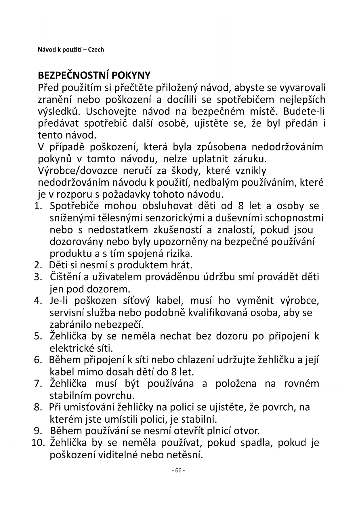 Před použitím si přečtěte přiložený návod, abyste se vyvarovali zranění nebo poškození a docílili se spotřebičem nejlepších výsledků. Uschovejte návod na bezpečném místě. Budete-li předávat spotřebič další osobě, ujistěte se, že byl předán i tento návod. V případě poškození, která byla způsobena nedodržováním pokynů v tomto návodu, nelze uplatnit záruku. Výrobce/dovozce neručí za škody, které vznikly nedodržováním návodu k použití, nedbalým používáním, které je v rozporu s požadavky tohoto návodu.