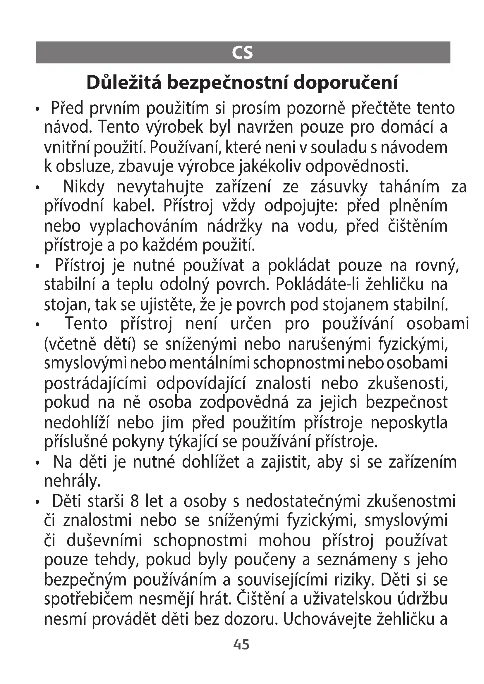 - Děti starši 8 let a osoby s nedostatečnými zkušenostmi či znalostmi nebo se sníženými fyzickými, smyslovými či duševními schopnostmi mohou přístroj používat pouze tehdy, pokud byly poučeny a seznámeny s jeho bezpečným používáním a souvisejícími riziky. Děti si se spotřebičem nesmějí hrát. Čištění a uživatelskou údržbu nesmí provádět děti bez dozoru. Uchovávejte žehličku a 45její kabel mimo dosah dětí mladších 8 let, pokud je pod napětím nebo se ochlazuje