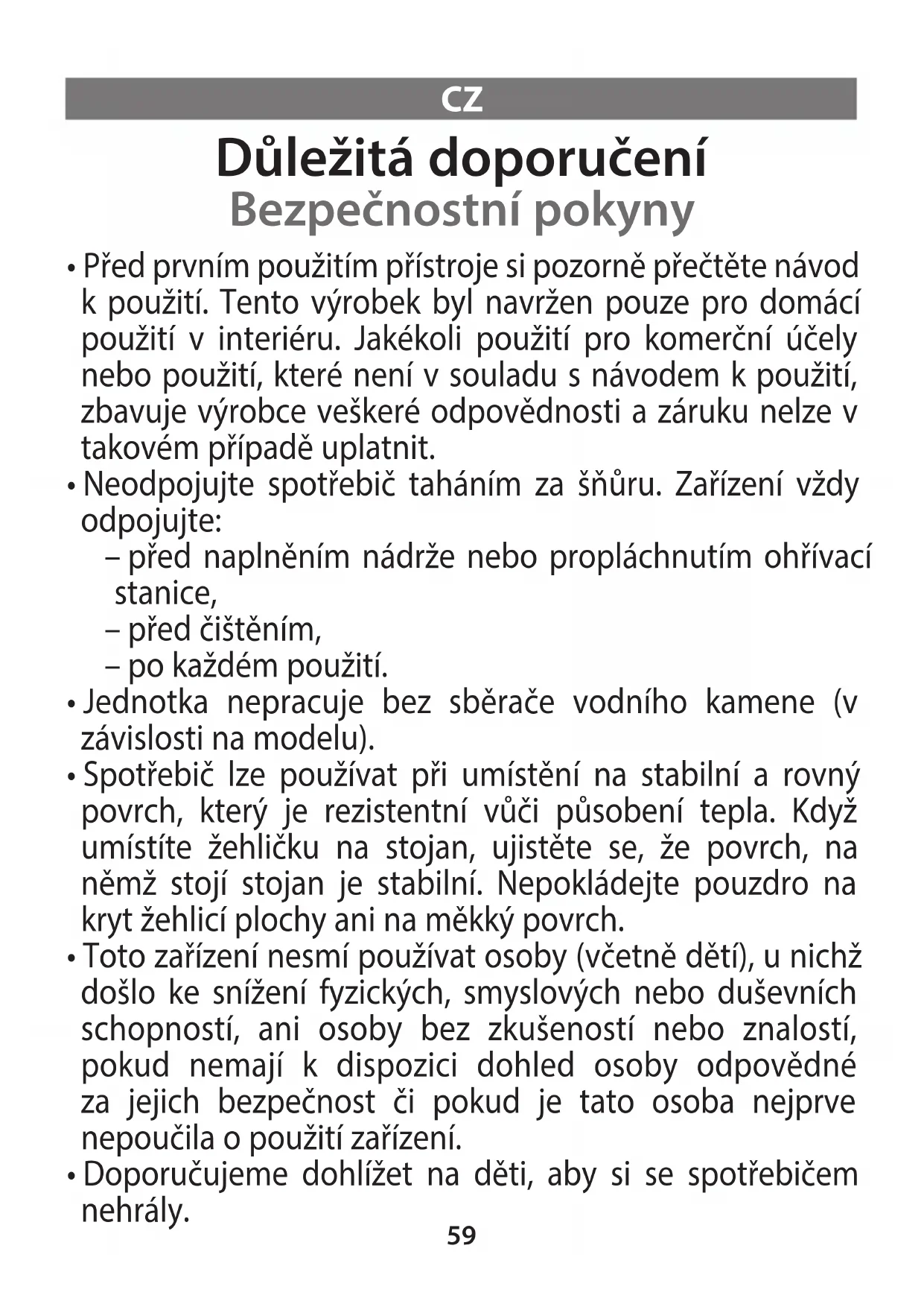 - Toto zařízení mohou používat děti od 8 let a starší a osoby, které nemají zkušenosti a znalosti, případně osoby, u nichž došlo ke snížení fyzických, smyslových nebo duševních schopností, pokud byly seznámeny a jsou pod dohledem při používání zařízení bezpečným způsobem a pokud znají případná rizika. Nedovolte dětem, aby si se zařízením hrály. Nedovolte dětem, aby bez dozoru prováděly čištění či údržbu spotřebiče. Žehličku a šňůru uchovávejte mimo dosah dětí mladších 8 let ve chvíli, kdy je žehlička pod napětím či v průběhu chladnutí.