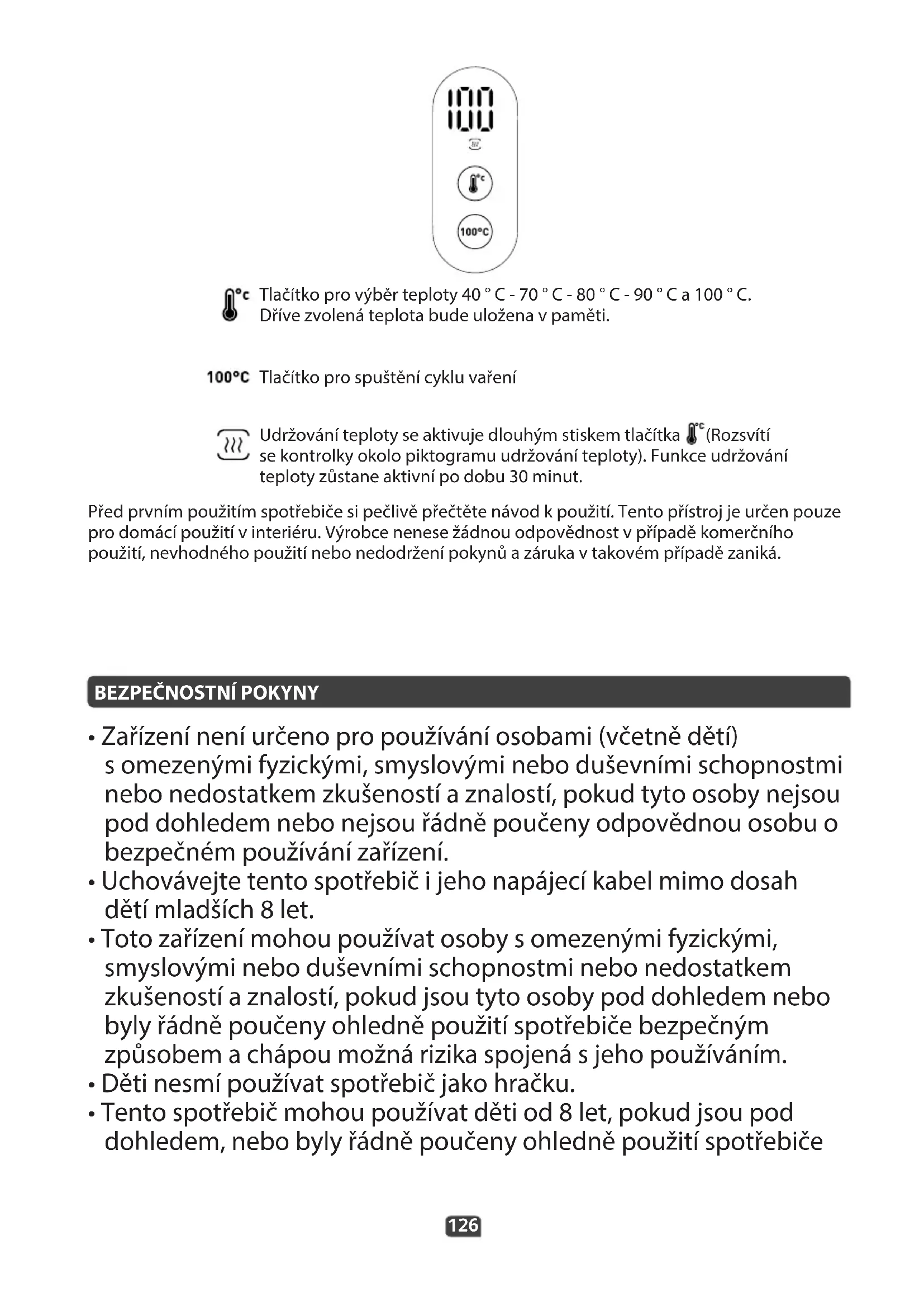 Tlačítko pro výběr teploty 40 ° C - 70 ° C - 80 ° C - 90 ° C a 100 ° C. Dříve zvolená teplota bude uložena v paměti. Tlačítko pro spuštění cyklu vaření Udržování teploty se aktivuje dlouhým stiskem tlačítka (Rozsvítí se kontrolky okolo piktogramu udržování teploty). Funkce udržování teploty zůstane aktivní po dobu 30 minut. Před prvním použitím spotřebiče si pečlivě přečtěte návod k použití. Tento přístroj je určen pouze pro domácí použití v interiéru. Výrobce nenese žádnou odpovědnost v případě komerčního použití, nevhodného použití nebo nedodržení pokynů a záruka v takovém případě zaniká.127 bezpečným způsobem a chápou možná rizika spojená s jeho používáním. Čištění a údržbu nemohou provádět děti, výjimku tvoří děti starší 8 let, pokud jsou pod dohledem dospělé osoby.