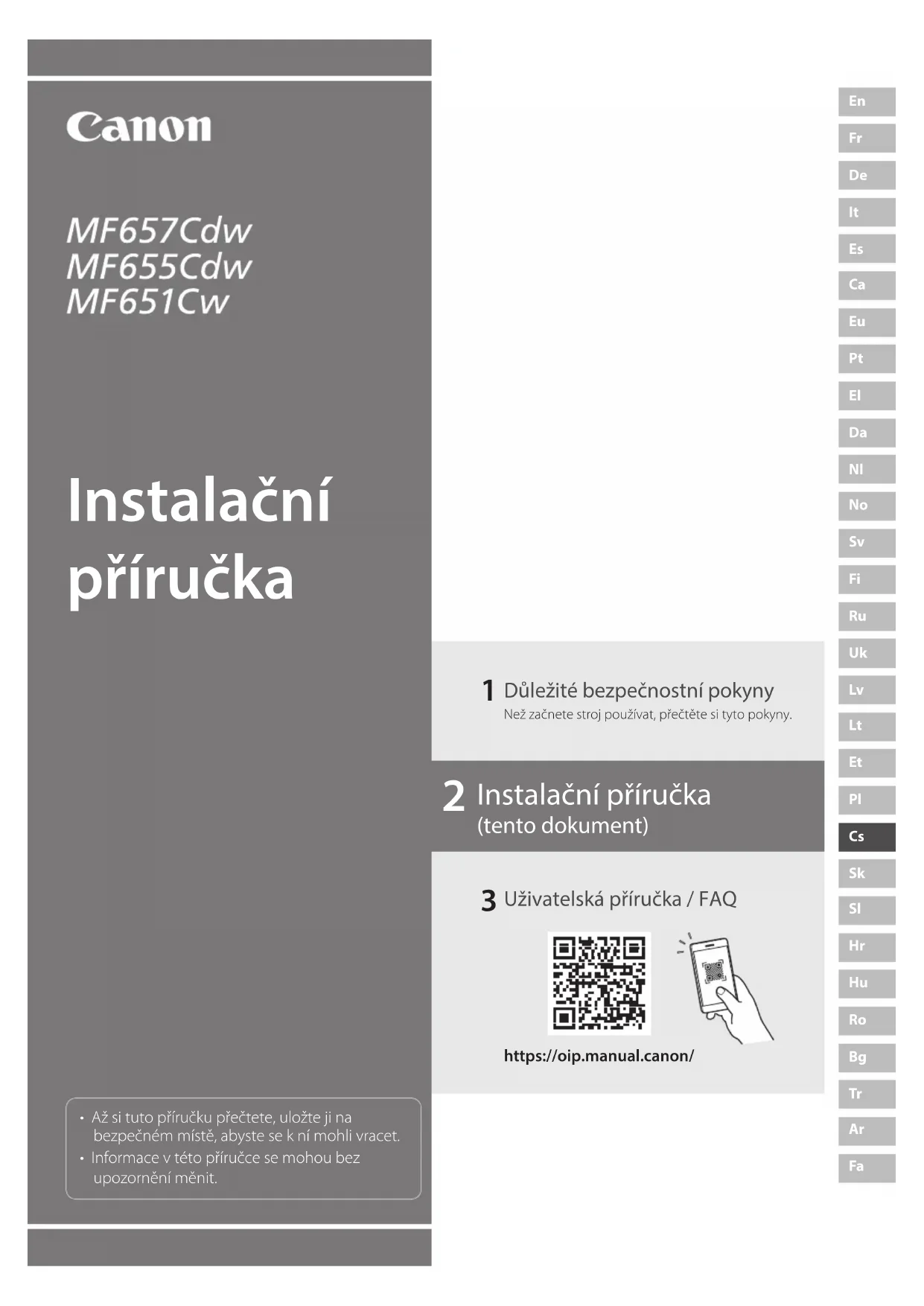 - Až si tuto příručku přečtete, uložte ji na bezpečném místě, abyste se k ní mohli vracet.• Informace v této příručce se mohou bez upozornění měnit.https://oip.manual.canon/ Důležité bezpečnostní pokynyNež začnete stroj používat, přečtěte si tyto pokyny. Uživatelská příručka / FAQ