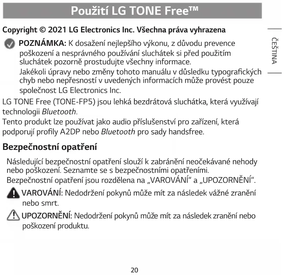 Copyright © 2021 LG Electronics Inc. Všechna práva vyhrazena POZNÁMKA: K dosažení nejlepšího výkonu, z důvodu prevence poškození a nesprávného používání sluchátek si před použitím sluchátek pozorně prostudujte všechny informace. Jakékoli úpravy nebo změny tohoto manuálu v důsledku typograckých chyb nebo nepřesností v uvedených informacích může provést pouze společnost LG Electronics Inc. LG TONE Free (TONE-FP5) jsou lehká bezdrátová sluchátka, která využívají technologii Bluetooth. Tento produkt lze používat jako audio příslušenství pro zařízení, která podporují proly A2DP nebo Bluetooth pro sady handsfree. Bezpečnostní opatření Následující bezpečnostní opatření slouží k zabránění neočekávané nehody nebo poškození. Seznamte se s bezpečnostními opatřeními. Bezpečnostní opatření jsou rozdělena na „VAROVÁNÍ“ a „UPOZORNĚNÍ“.