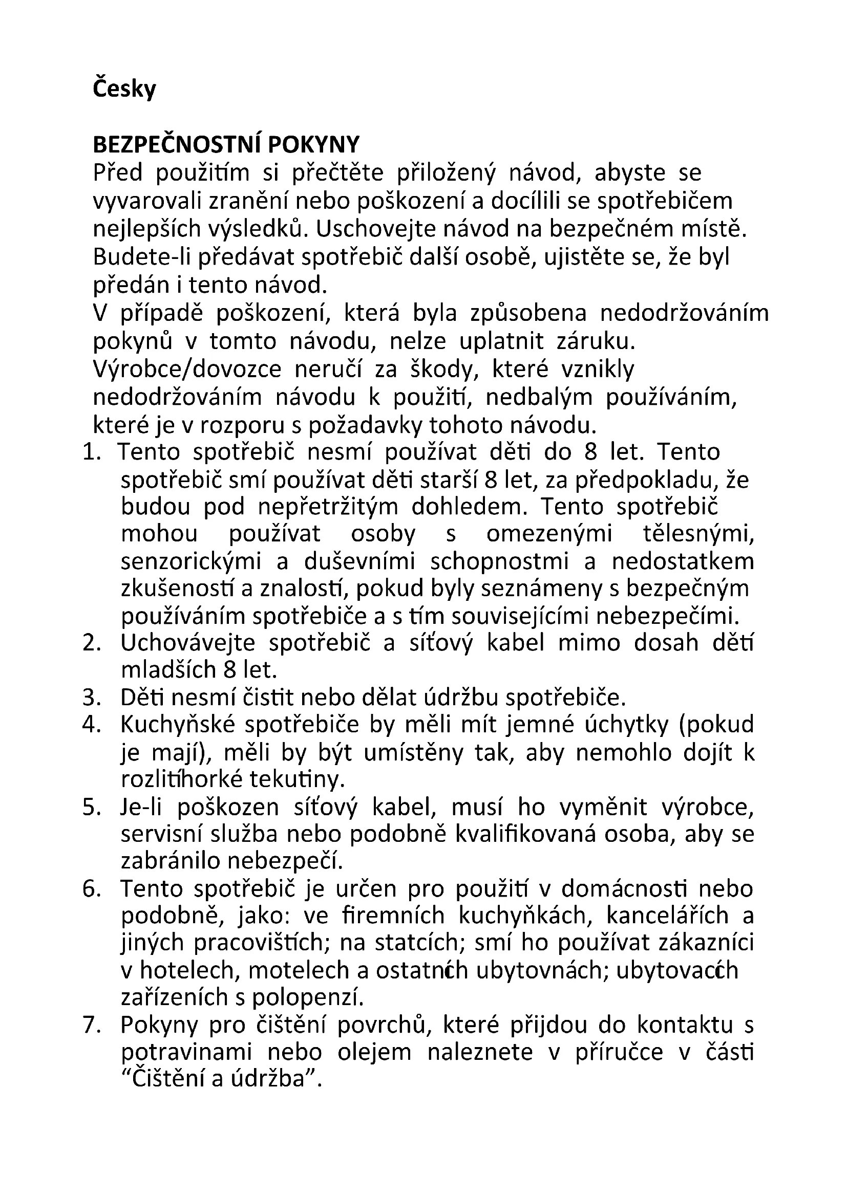Před použitím si přečtěte přiložený návod, abyste se vyvarovali zranění nebo poškození a docílili se spotřebičem nejlepších výsledků. Uschovejte návod na bezpečném místě. Budete-li předávat spotřebič další osobě, ujistěte se, že byl předán i tento návod. V případě poškození, která byla způsobena nedodržováním pokynů v tomto návodu, nelze uplatnit záruku. Výrobce/dovozce neručí za škody, které vznikly nedodržováním návodu k použití, nedbalým používáním, které je v rozporu s požadavky tohoto návodu.