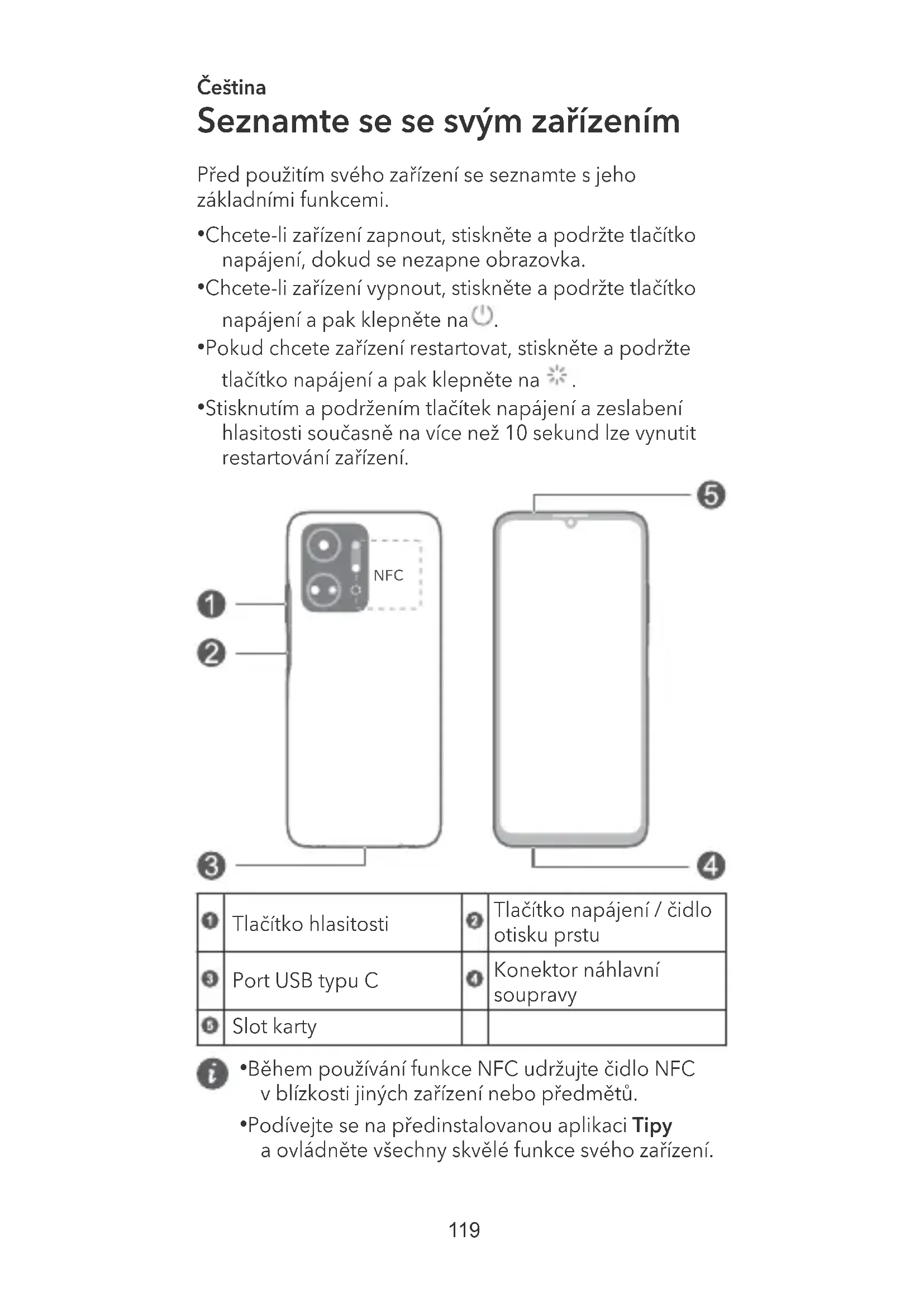 - Stisknutím a podržením tlačítek napájení a zeslabení hlasitosti současně na více než 10 sekund lze vynutit restartování zařízení. NFC Tlačítko hlasitosti Tlačítko napájení / čidlo otisku prstu Port USB typu C Konektor náhlavní soupravy Slot karty