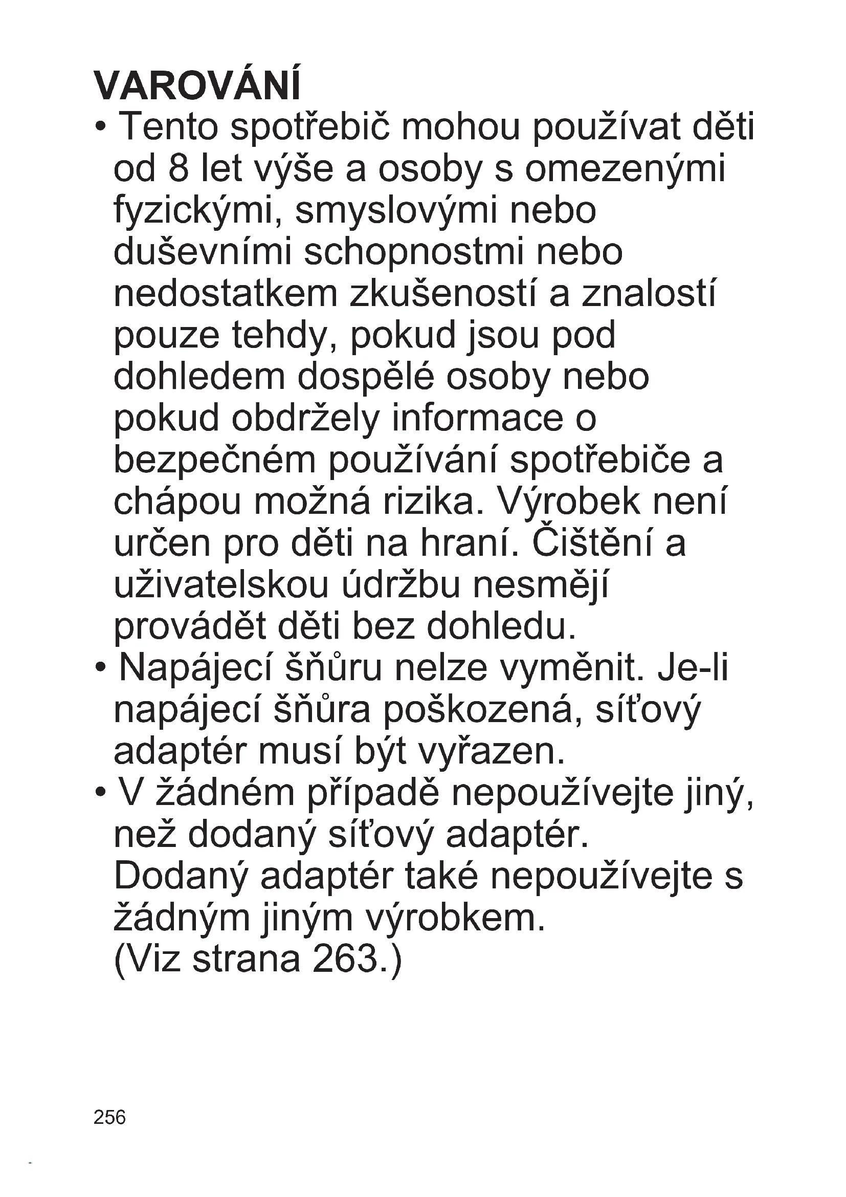 - Tentospotřebičmohoupoužívatděti od8letvýšeaosobysomezenými fyzickými,smyslovýminebo duševnímischopnostminebo nedostatkemzkušenostíaznalostí pouze tehdy, pokud jsou pod dohledemdospěléosobynebo pokudobdrželyinformaceo bezpečnémpoužíváníspotřebičea chápoumožnárizika.Výrobeknení určenprodětinahraní.Čištěnía uživatelskouúdržbunesmějí provádětdětibezdohledu.
