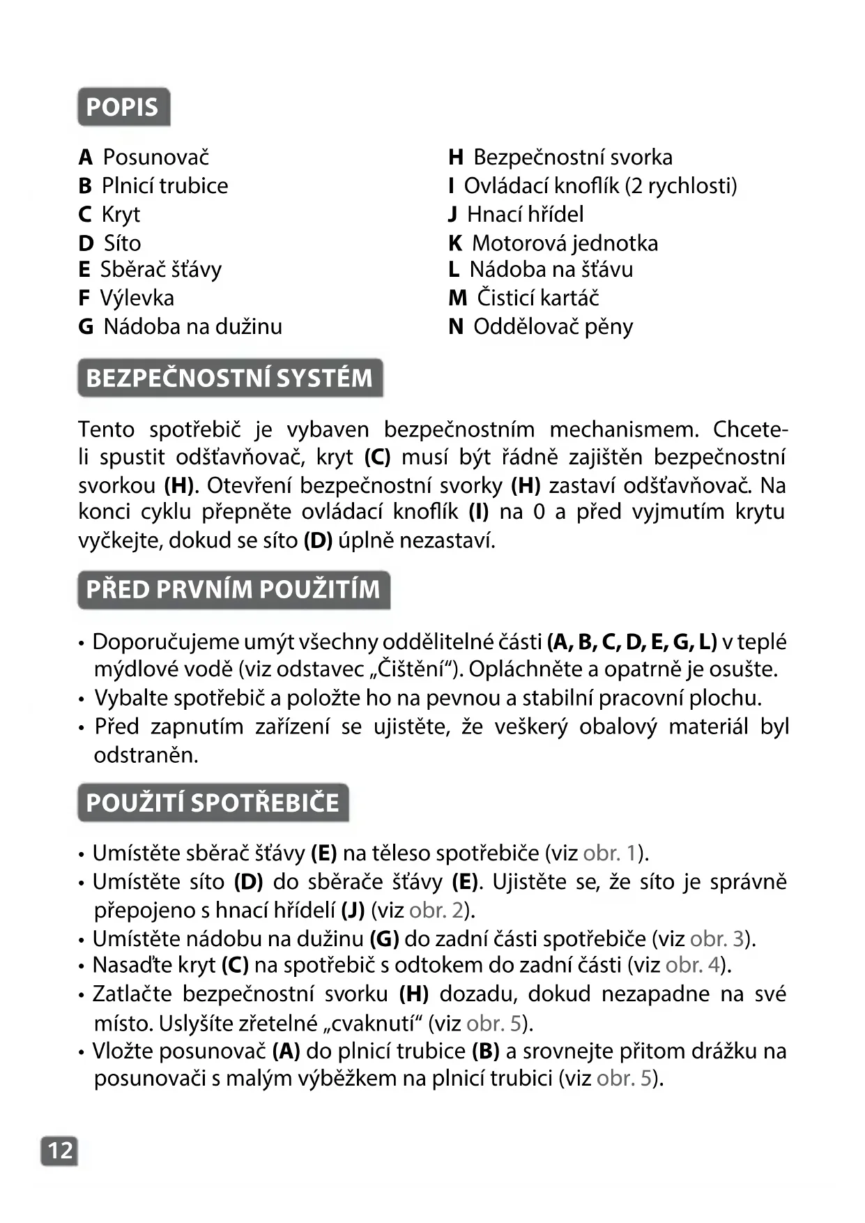 A Posunovač B Plnicí trubice C Kryt D Síto E Sběrač šťávy F Výlevka G Nádoba na dužinu H Bezpečnostní svorka I Ovládací knoík (2 rychlosti) J Hnací hřídel K Motorová jednotka L Nádoba na šťávu M Čisticí kartáč N Oddělovač pěny Tento spotřebič je vybaven bezpečnostním mechanismem. Chcete- li spustit odšťavňovač, kryt (C) musí být řádně zajištěn bezpečnostní svorkou (H). Otevření bezpečnostní svorky (H) zastaví odšťavňovač. Na konci cyklu přepněte ovládací knoík (I) na 0 a před vyjmutím krytu vyčkejte, dokud se síto (D) úplně nezastaví.