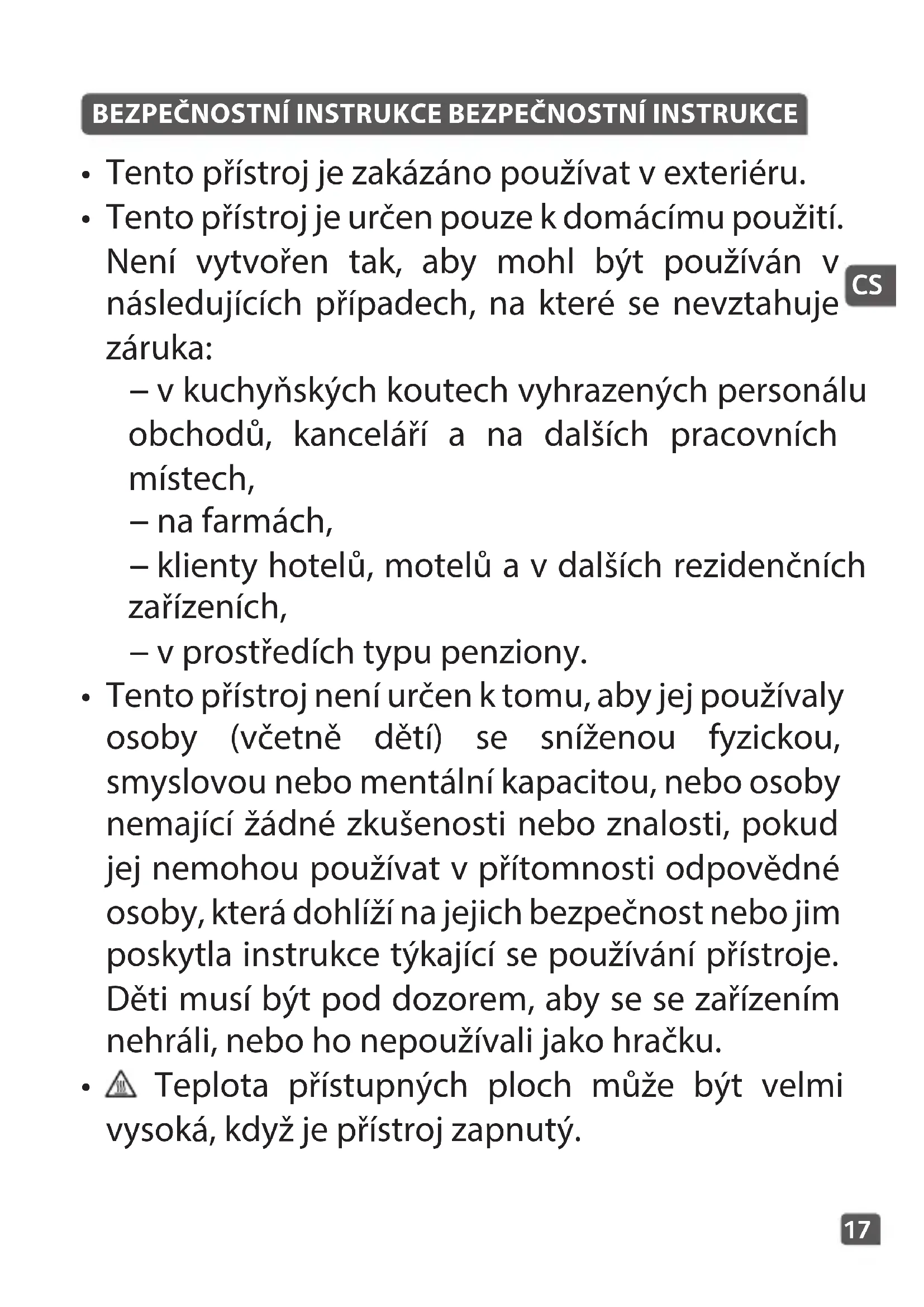 - Tento přístroj není určen k tomu, aby jej používaly osoby (včetně dětí) se sníženou fyzickou, smyslovou nebo mentální kapacitou, nebo osoby nemající žádné zkušenosti nebo znalosti, pokud jej nemohou používat v přítomnosti odpovědné osoby, která dohlíží na jejich bezpečnost nebo jim poskytla instrukce týkající se používání přístroje. Děti musí být pod dozorem, aby se se zařízením nehráli, nebo ho nepoužívali jako hračku.