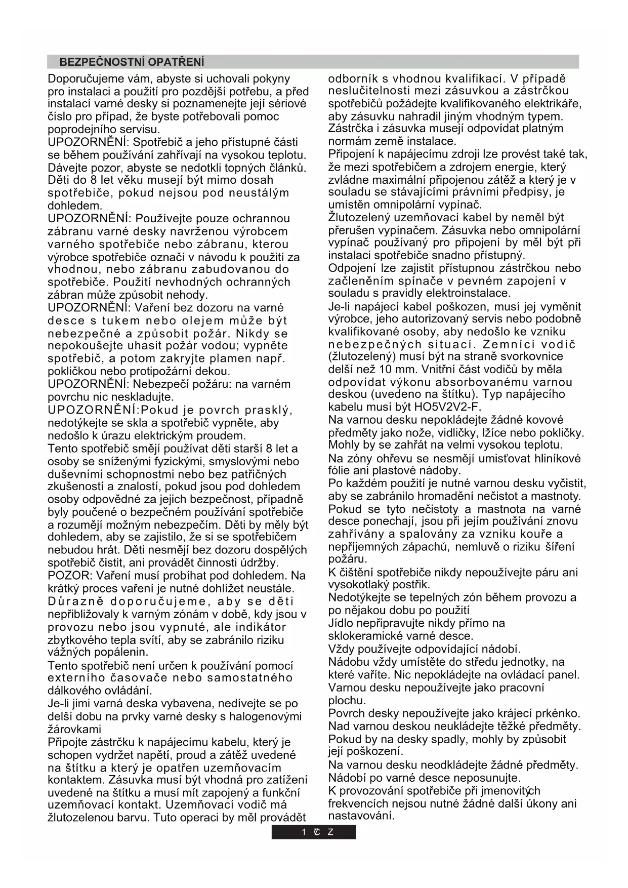 .1 Ochrana životního prostředí .2 Instalace .3 Elektrické připojení .4uDoporučení ohledně nádobí pro varnou desk .5 Použití .6 Čištění a údržba .7 Řešení problémů