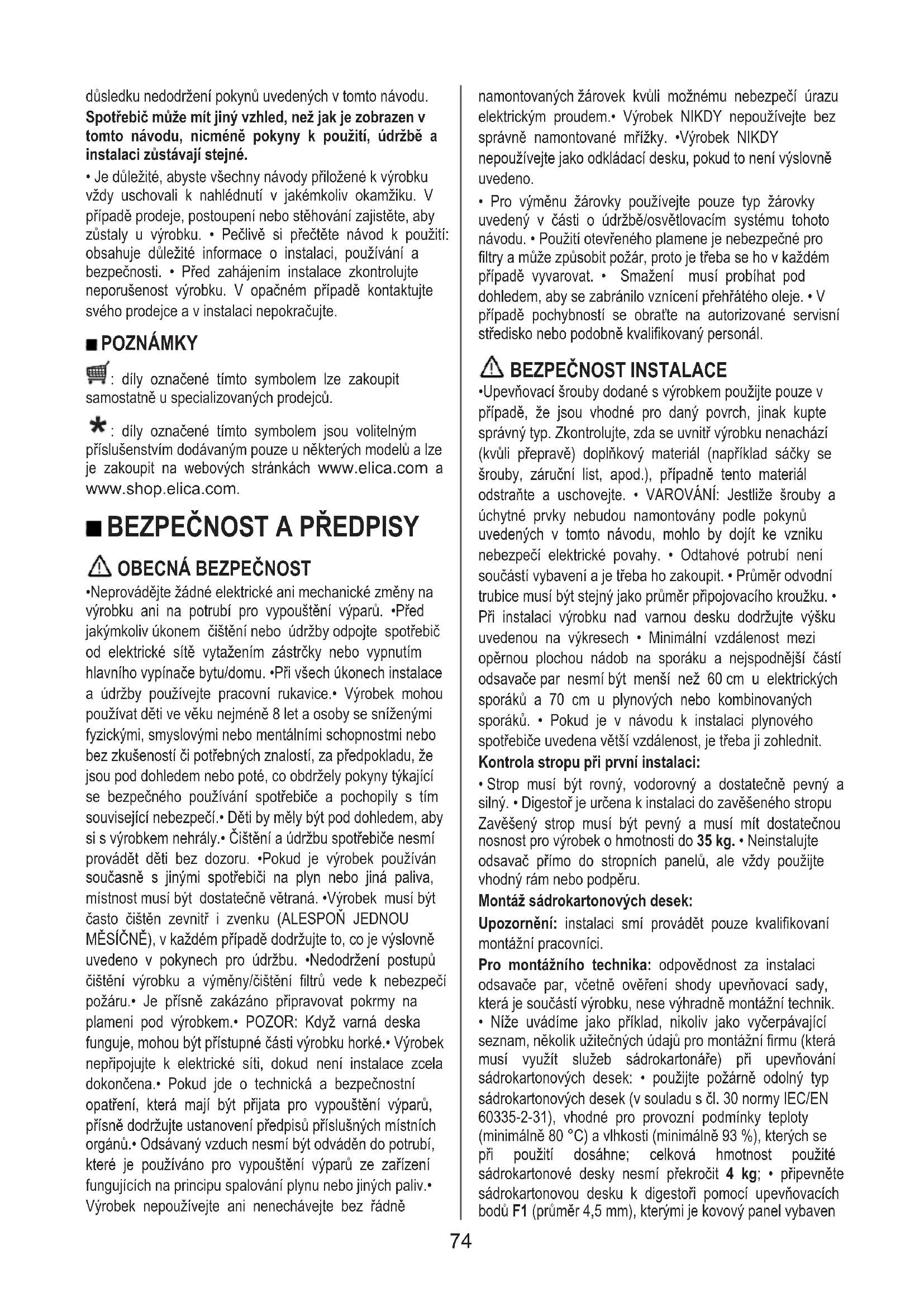 - Je důležité, abyste všechny návody přiložené k výrobku vždy uschovali k nahlédnutí v jakémkoliv okamžiku. V případě prodeje, postoupení nebo stěhování zajistěte, aby zůstaly u výrobku. • Pečlivě si přečtěte návod k použití: obsahuje důležité informace o instalaci, používání a bezpečnosti. • Před zahájením instalace zkontrolujte neporušenost výrobku. V opačném případě kontaktujte svého prodejce a v instalaci nepokračujte. POZNÁMKY : díly označené tímto symbolem lze zakoupit samostatně u specializovaných prodejců. : díly označené tímto symbolem jsou volitelným příslušenstvím dodávaným pouze u některých modelů a lze je zakoupit na webových stránkách www.elica.com a www.shop.elica.com.