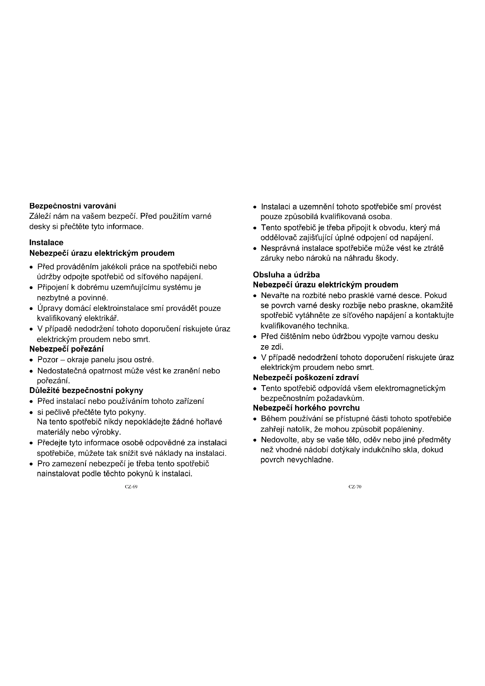 - Используйте посуду с диаметром основания, совпадающим с графическим обозначением выбранной зоны.CZ-69 Bezpečnostní varování Záleží nám na vašem bezpečí. Před použitím varné desky si přečtěte tyto informace. Instalace Nebezpečí úrazu elektrickým proudem
