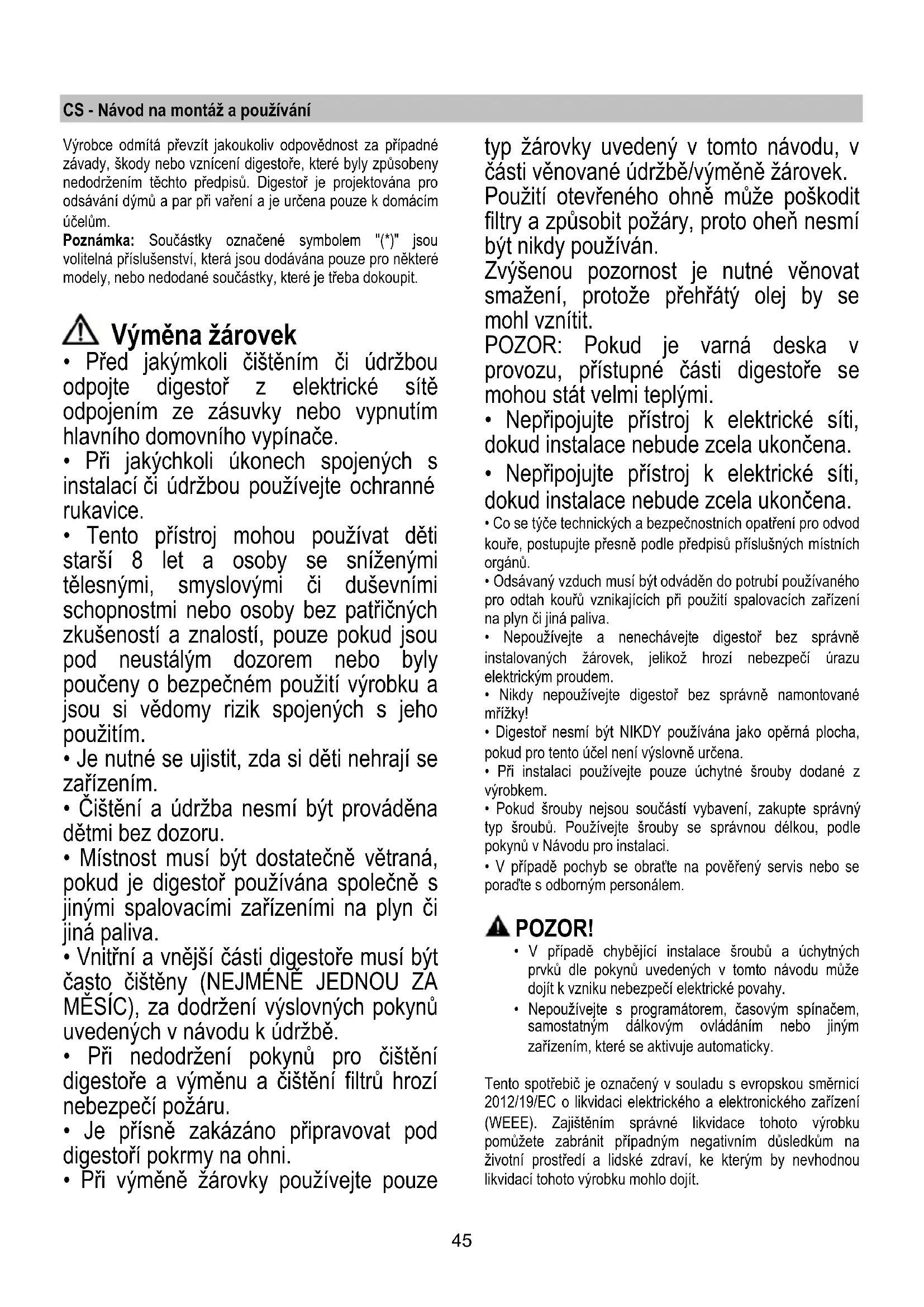 - Při výměně žárovky používejte pouze typ žárovky uvedený v tomto návodu, v části věnované údržbě/výměně žárovek. Použití otevřeného ohně může poškodit filtry a způsobit požáry, proto oheň nesmí být nikdy používán. Zvýšenou pozornost je nutné věnovat smažení, protože přehřátý olej by se mohl vznítit. POZOR: Pokud je varná deska v provozu, přístupné části digestoře se mohou stát velmi teplými.