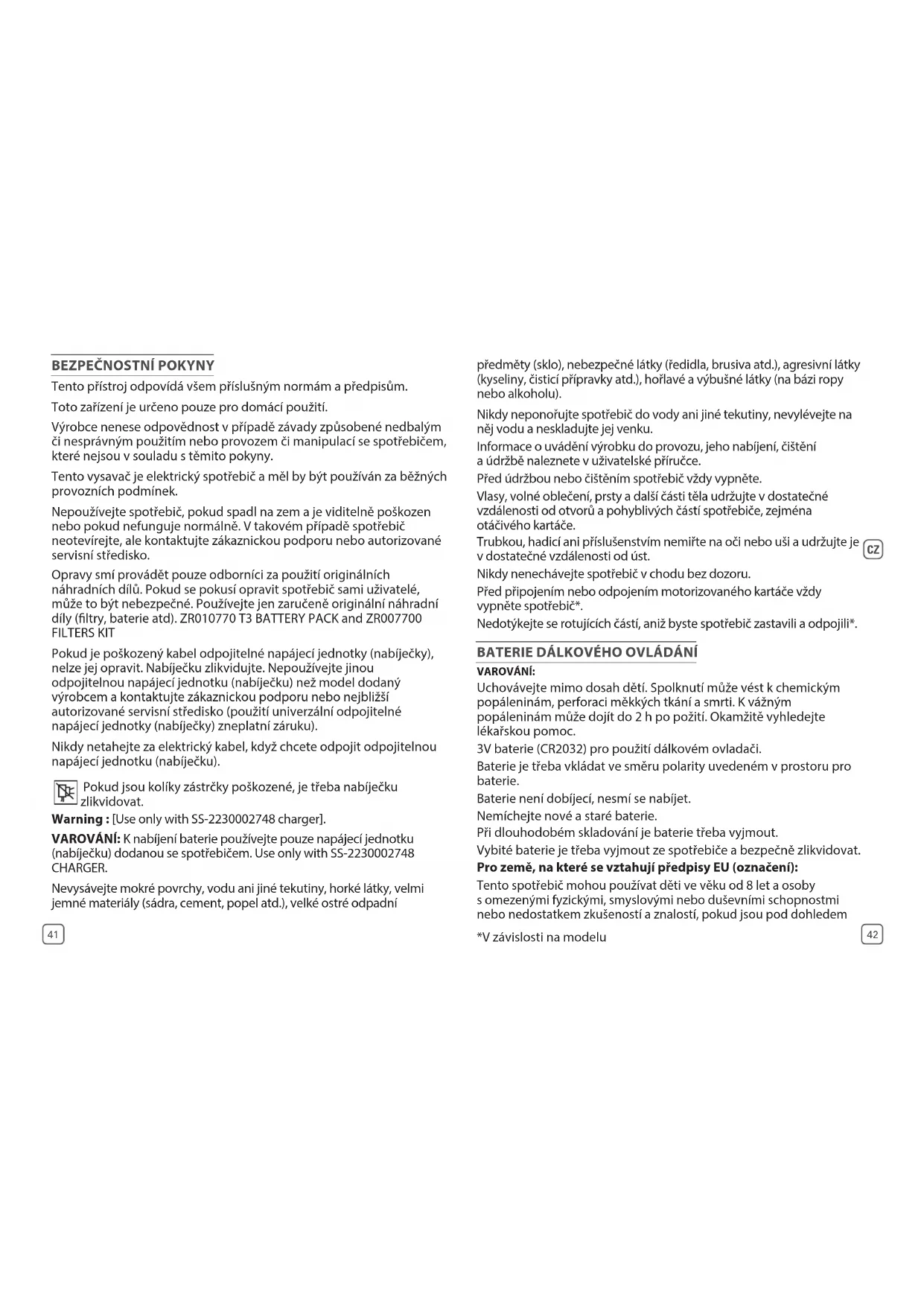 VAROVÁNÍ: Knabíjení baterie používejte pouze napájecí jednotku (nabíječku) dodanou se spotřebičem. Use only with SS-2230002748 CHARGER. Nevysávejte mokré povrchy, vodu ani jiné tekutiny, horké látky, velmi jemné materiály (sádra, cement, popel atd.), velké ostré odpadnívrozmezí 0–45°C. Držte mimo dosah dětí. Baterii nerozebírejte ane- vhazujte do ohně. Normální rozsah teplot pro nabíjení baterie je 0–45°C.