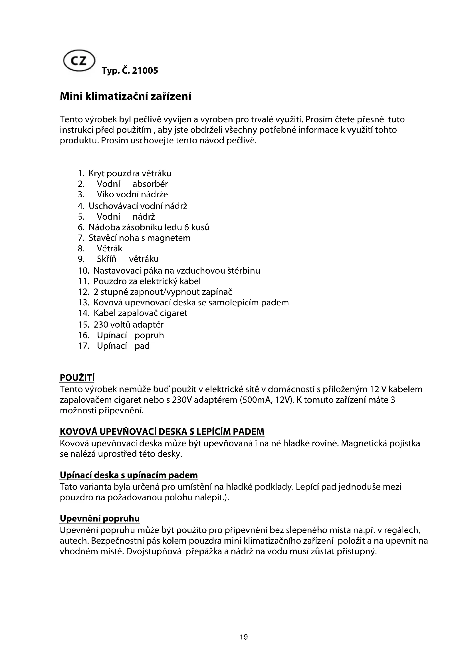 POUŽITÍ Tento výrobek nemůže buď použit v elektrické sítě v domácnosti s přiloženým 12 V kabelem zapalovačem cigaret nebo s 230V adaptérem (500mA, 12V). K tomuto zařízení máte 3 možnosti připevnění. KOVOVÁ UPEVŇOVACÍ DESKA S LEPÍCÍM PADEM Kovová upevňovací deska může být upevňovaná i na né hladké rovině. Magnetická pojistka se nalézá uprostřed této desky. Upínací deska s upínacím padem Tato varianta byla určená pro umístění na hladké podklady. Lepící pad jednoduše mezi pouzdro na požadovanou polohu nalepit.). Upevnění popruhu Upevnění popruhu může být použito pro připevnění bez slepeného místa na.př. v regálech, autech. Bezpečnostní pás kolem pouzdra mini klimatizačního zařízení položit a na upevnit na vhodném místě. Dvojstupňová přepážka a nádrž na vodu musí zůstat přístupný.20 Instalace Lepící štítek kovové upevňovací desky odstraňte a upevněte ho na požadovanou polohu. Stavěcí nohu s magnetem posaďte na kovovou upevňovací desku. Aby byl dosažen dostatečně účinek odvzdušnění, nesmí vzdálenost mezi mini- klimatizačním zařízením a Vámi činit více než 0,5 m. Funkce Víko nádrže na vodu otevřte. Nádrž na vodu vyjmete, potom ochranný klobouček odšroubovat a nádrž naplňte s chladnou vodou. Nádrž na vodu opět nasadit do pouzdra a asi 15 minut čekat, až se lamely vodního absorbéru plně nasály . Mini klimatizační zařízení s 2 stupňovým vypínačem na I - na pomalé a na II - na rychlé na požadovanou rychlost zapnout. Pro ještě lepší chladicí efekt jednoduše 6 válců ledu naplnit a nechat zamrznout. Zamrznuté valce ledu opět vsadit do nádrže na vodu. Čištění Kryt pouzdra otevřte a vodní absorbér vyjmete. Je doporučeno, lamely absorbéru jednou týdně čistit. S mýdlovým louhem lamely opatrně kartáčovat. Po čištění vodného absorbéru opět vložit do pouzdra a zavřít kryt. K užití nemusíte na to čekat , že lamely\jsou vysušeny. Doporučení Zabezpečte , že mini klimatizační zařízení je uschováno v suchu a je chráněno před vlhkostí.