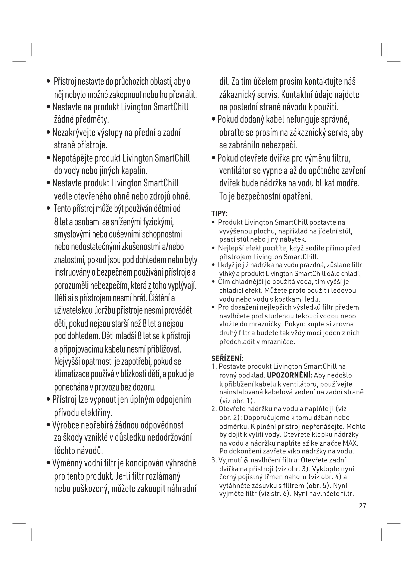 vodě s mýdlem. Přebytečnou vodu vylijte a nechte uschnout na vzduchu. DŮLEŽITÉ: Pokud na filtru zjistíte plíseň nebo nepříjemný zápach, přístroj zastavte a filtr před dalším použitím vyčistěte. Filtr úplně ponořte do hrnce nebo mísy s čistou vodou a bílým octem v poměru jedna ku jedné – nechte 45-60 minut namáčet. Vypláchněte teplou vodou, vyždímejte a nechte uschnout na vzduchu. VÝMĚNA FILTRU: Vodní filtr by měl být měněn každých 3-6 měsíců, resp. tehdy, když máte dojem, že váš produkt Livington SmartChill již nefunguje tak, jak by měl. Než je opět nasazen filtr, bliká nádržka na vodu modře. K objednání filtru prosím kontaktujte náš zákaznický servis. Kontaktní údaje najdete na poslední straně návodu k použití.