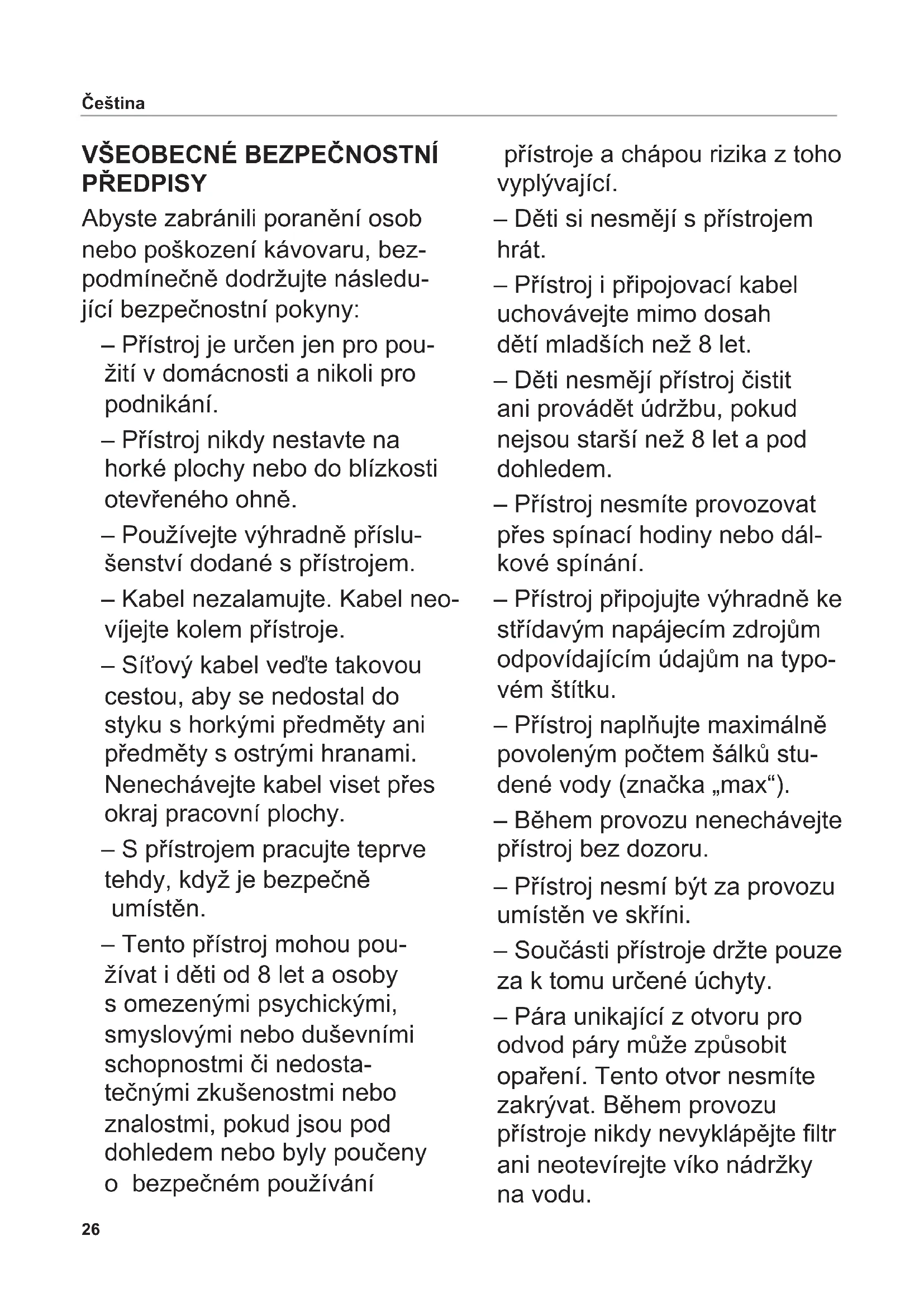 PŘEDPISY Abyste zabránili poranění osob nebo poškození kávovaru, bez- podmínečně dodržujte následu- jící bezpečnostní pokyny: – Přístroj je určen jen pro pou- žití v domácnosti a nikoli pro podnikání. – Přístroj nikdy nestavte na horké plochy nebo do blízkosti otevřeného ohně. – Používejte výhradně příslu- šenství dodané s přístrojem. – Kabel nezalamujte. Kabel neo- víjejte kolem přístroje. – Síťový kabel veďte takovou cestou, aby se nedostal do styku s horkými předměty ani předměty s ostrými hranami. Nenechávejte kabel viset přes okraj pracovní plochy. – S přístrojem pracujte teprve tehdy, když je bezpečně umístěn. – Tento přístroj mohou pou- žívat i děti od 8 let a osoby s omezenými psychickými, smyslovými nebo duševními schopnostmi či nedosta- tečnými zkušenostmi nebo znalostmi, pokud jsou pod dohledem nebo byly poučeny o bezpečném používání přístroje a chápou rizika z toho vyplývající. – Děti si nesmějí s přístrojem hrát. – Přístroj i připojovací kabel uchovávejte mimo dosah dětí mladších než 8 let. – Děti nesmějí přístroj čistit ani provádět údržbu, pokud nejsou starší než 8 let a pod dohledem. – Přístroj nesmíte provozovat přes spínací hodiny nebo dál- kové spínání. – Přístroj připojujte výhradně ke střídavým napájecím zdrojům odpovídajícím údajům na typo- vém štítku. – Přístroj naplňujte maximálně povoleným počtem šálků stu- dené vody (značka „max“). – Během provozu nenechávejte přístroj bez dozoru. – Přístroj nesmí být za provozu umístěn ve skříni. – Součásti přístroje držte pouze za k tomu určené úchyty. – Pára unikající z otvoru pro odvod páry může způsobit opaření. Tento otvor nesmíte zakrývat. Během provozu přístroje nikdy nevyklápějte ltr ani neotevírejte víko nádržky na vodu. Čeština27 – Do zapnutého přístroje ani do přístroje, který je ještě horký, nenalévejte vodu. – Izolovanou konvici neohřívejte na plynovém ani elektrickém vařiči ani v mikrovlnné troubě nebo podobných zařízeních. Nebezpečí úrazu elektrickým proudem – Při poruchách, před každým čištěním a v době, kdy je pří- stroj na delší dobu odstaven nebo není pod dohledem vždy vytáhněte síťovou zástrčku ze zásuvky. Tahejte přitom za vidlici, nikoli za kabel. – Přístroj nikdy neponořujte do vody nebo jiných kapalin. Přístroj nikdy nevystavujte dešti nebo jinému působení vlhkosti. Pokud by přístroj přece jen spadl do vody, vytáhněte nejprve síťovou vidlici ze zásuvky a teprve potom vyta- hujte přístroj z vody. Než poté přístroj opět uvedete do pro- vozu, nechejte ho zkontrolovat v autorizovaném servisu. – Přístroj neberte do vlhkých rukou. Nepoužívejte jej, jest- liže je mokrý nebo vlhký, nebo když stojíte na mokré podlaze. Přístroj nepoužívejte venku. – Při jakémkoli poškození sou- částí přístroje ihned přestaňte přístroj používat a obraťte se na zákaznický servis ritter. – Pokud je poškozen síťový kabel, musí být vyměněn výrobcem, jeho zákaznic- kým servisem nebo příslušně kvalikovanými osobami, aby nedošlo k ohrožení bezpečnosti. Čeština28 Odklopte přední a zadní obálku s obrázky. Před uvedením přístroje do provozu si podrobně přečtěte tento návod. Návod k obsluze uschovejte a předejte jej dalšímu uživateli spolu s přístrojem. Aktuální návod k obsluze máte k dispozici i na webu www.ritterwerk.de.