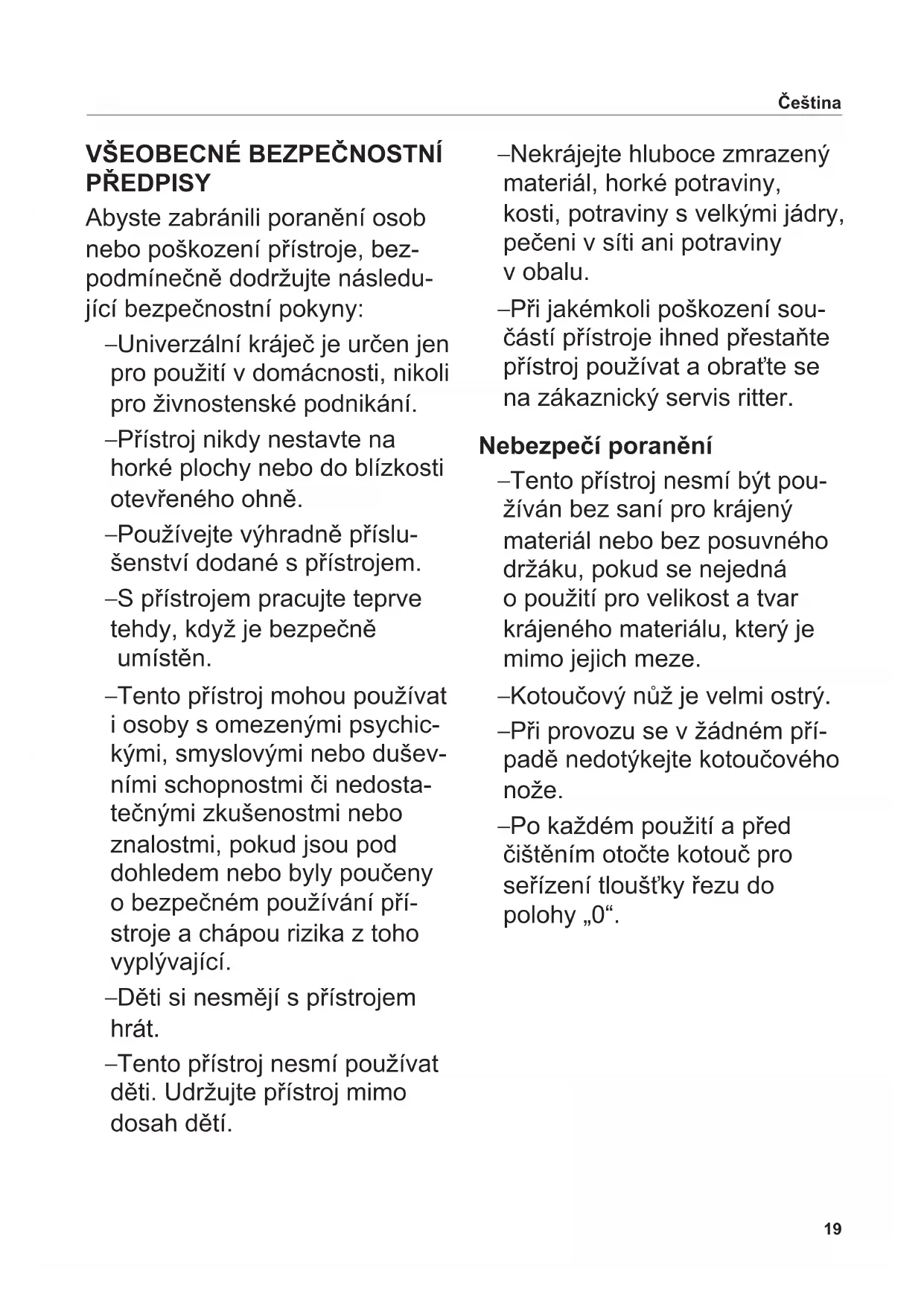 PŘEDPISY Abyste zabránili poranění osob nebo poškození přístroje, bez- podmínečně dodržujte následu- jící bezpečnostní pokyny: – Univerzální kráječ je určen jen pro použití v domácnosti, nikoli pro živnostenské podnikání. – Přístroj nikdy nestavte na horké plochy nebo do blízkosti otevřeného ohně. – Používejte výhradně příslu- šenství dodané s přístrojem. – S přístrojem pracujte teprve tehdy, když je bezpečně umístěn. – Tento přístroj mohou používat i osoby s omezenými psychic- kými, smyslovými nebo dušev- ními schopnostmi či nedosta- tečnými zkušenostmi nebo znalostmi, pokud jsou pod dohledem nebo byly poučeny o bezpečném používání pří- stroje a chápou rizika z toho vyplývající. – Děti si nesmějí s přístrojem hrát. – Tento přístroj nesmí používat děti. Udržujte přístroj mimo dosah dětí. – Nekrájejte hluboce zmrazený materiál, horké potraviny, kosti, potraviny s velkými jádry, pečeni v síti ani potraviny v obalu. – Při jakémkoli poškození sou- částí přístroje ihned přestaňte přístroj používat a obraťte se na zákaznický servis ritter. Nebezpečí poranění – Tento přístroj nesmí být pou- žíván bez saní pro krájený materiál nebo bez posuvného držáku, pokud se nejedná o použití pro velikost a tvar krájeného materiálu, který je mimo jejich meze. – Kotoučový nůž je velmi ostrý. – Při provozu se v žádném pří- padě nedotýkejte kotoučového nože. – Po každém použití a před čištěním otočte kotouč pro seřízení tloušťky řezu do polohy „0“. Čeština20 Odklopte přední a zadní obálku s obrázky. Před uvedením přístroje do provozu si podrobně přečtěte tento návod k obsluze. Návod k obsluze uschovejte a předejte jej dalšímu uživateli spolu s přístrojem. Aktuální návod k obsluze máte k dispozici i na webu www.ritterwerk.de.