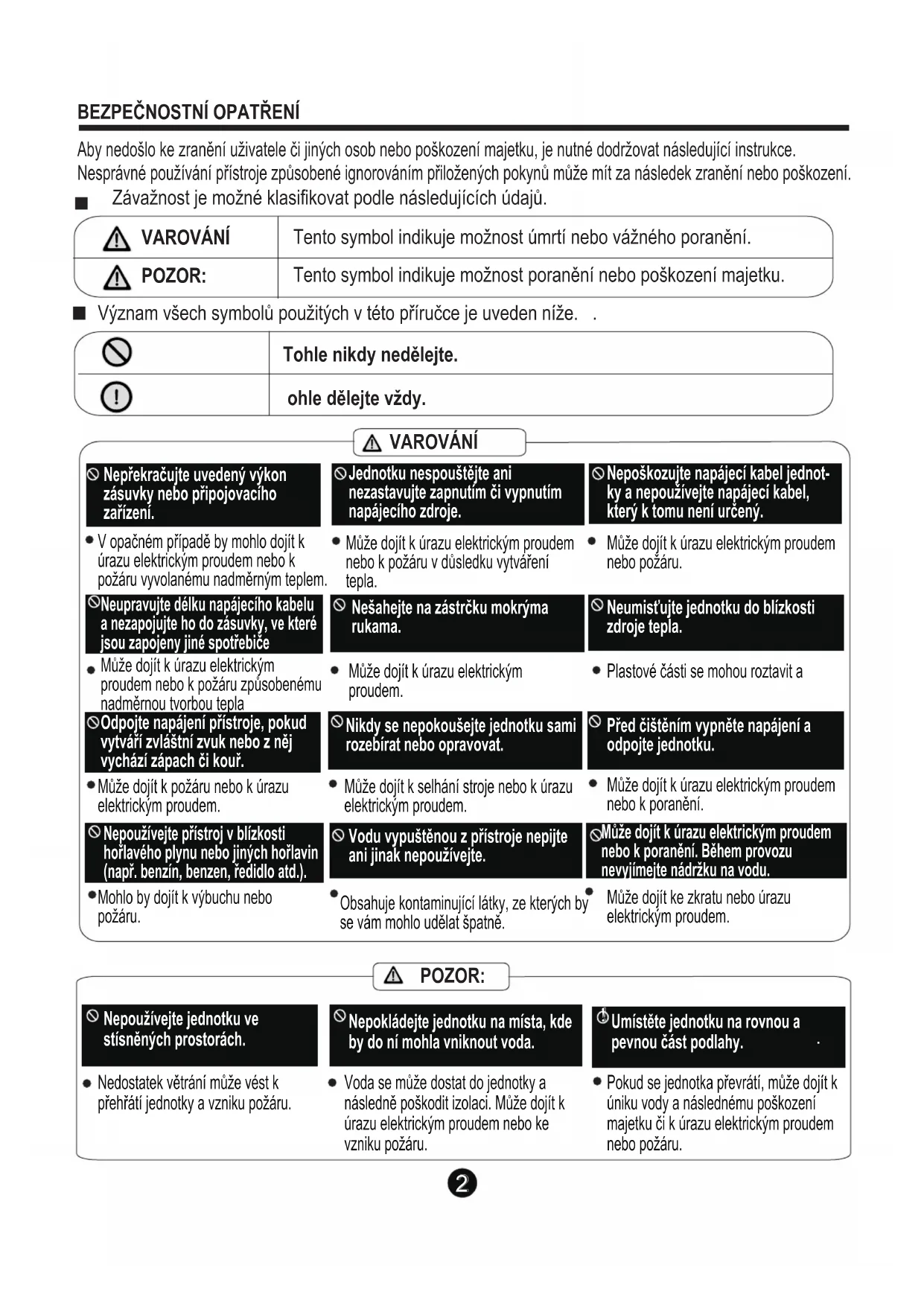 Aby nedošlo ke zranění uživatele či jiných osob nebo poškození majetku, je nutné dodržovat následující instrukce. Nesprávné používání přístroje způsobené ignorováním přiložených pokynů může mít za následek zranění nebo poškození. Závažnost je možné klasifikovat podle následujících údajů. Význam všech symbolů použitých v této příručce je uveden níže. VAROVÁNÍ Tohle nikdy nedělejte. ohle dělejte vždy. VAROVÁNÍ POZOR: Tento symbol indikuje možnost úmrtí nebo vážného poranění. POZOR: Tento symbol indikuje možnost poranění nebo poškození majetku. Nepřekračujte uvedený výkon zásuvky nebo připojovacího zařízení. V opačném případě by mohlo dojít k úrazu elektrickým proudem nebo k požáru vyvolanému nadměrným teplem. Může dojít k úrazu elektrickým proudem nebo k požáru v důsledku vytváření tepla. Může dojít k úrazu elektrickým proudem nebo požáru. Jednotku nespouštějte ani nezastavujte zapnutím či vypnutím napájecího zdroje. Nepoškozujte napájecí kabel jednot- ky a nepoužívejte napájecí kabel, který k tomu není určený. Neupravujte délku napájecího kabelu a nezapojujte ho do zásuvky, ve které jsou zapojeny jiné spotřebiče Může dojít k úrazu elektrickým proudem nebo k požáru způsobenému nadměrnou tvorbou tepla Může dojít k úrazu elektrickým proudem. Plastové části se mohou roztavit a Nešahejte na zástrčku mokrýma rukama. Neumisťujte jednotku do blízkosti zdroje tepla. Odpojte napájení přístroje, pokud vytváří zvláštní zvuk nebo z něj vychází zápach či kouř. Může dojít k požáru nebo k úrazu elektrickým proudem. Může dojít k selhání stroje nebo k úrazu elektrickým proudem. Může dojít k úrazu elektrickým proudem nebo k poranění. Nikdy se nepokoušejte jednotku sami rozebírat nebo opravovat. Před čištěním vypněte napájení a odpojte jednotku. Nepoužívejte přístroj v blízkosti hořlavého plynu nebo jiných hořlavin (např. benzín, benzen, ředidlo atd.). Mohlo by dojít k výbuchu nebo požáru. Obsahuje kontaminující látky, ze kterých by se vám mohlo udělat špatně. Může dojít ke zkratu nebo úrazu elektrickým proudem. Vodu vypuštěnou z přístroje nepijte ani jinak nepoužívejte. Může dojít k úrazu elektrickým proudem nebo k poranění. Během provozu nevyjímejte nádržku na vodu. Nepoužívejte jednotku ve stísněných prostorách. Nedostatek větrání může vést k přehřátí jednotky a vzniku požáru. Voda se může dostat do jednotky a následně poškodit izolaci. Může dojít k úrazu elektrickým proudem nebo ke vzniku požáru. Pokud se jednotka převrátí, může dojít k úniku vody a následnému poškození majetku či k úrazu elektrickým proudem nebo požáru. Nepokládejte jednotku na místa, kde by do ní mohla vniknout voda. Umístěte jednotku na rovnou a pevnou část podlahy.3