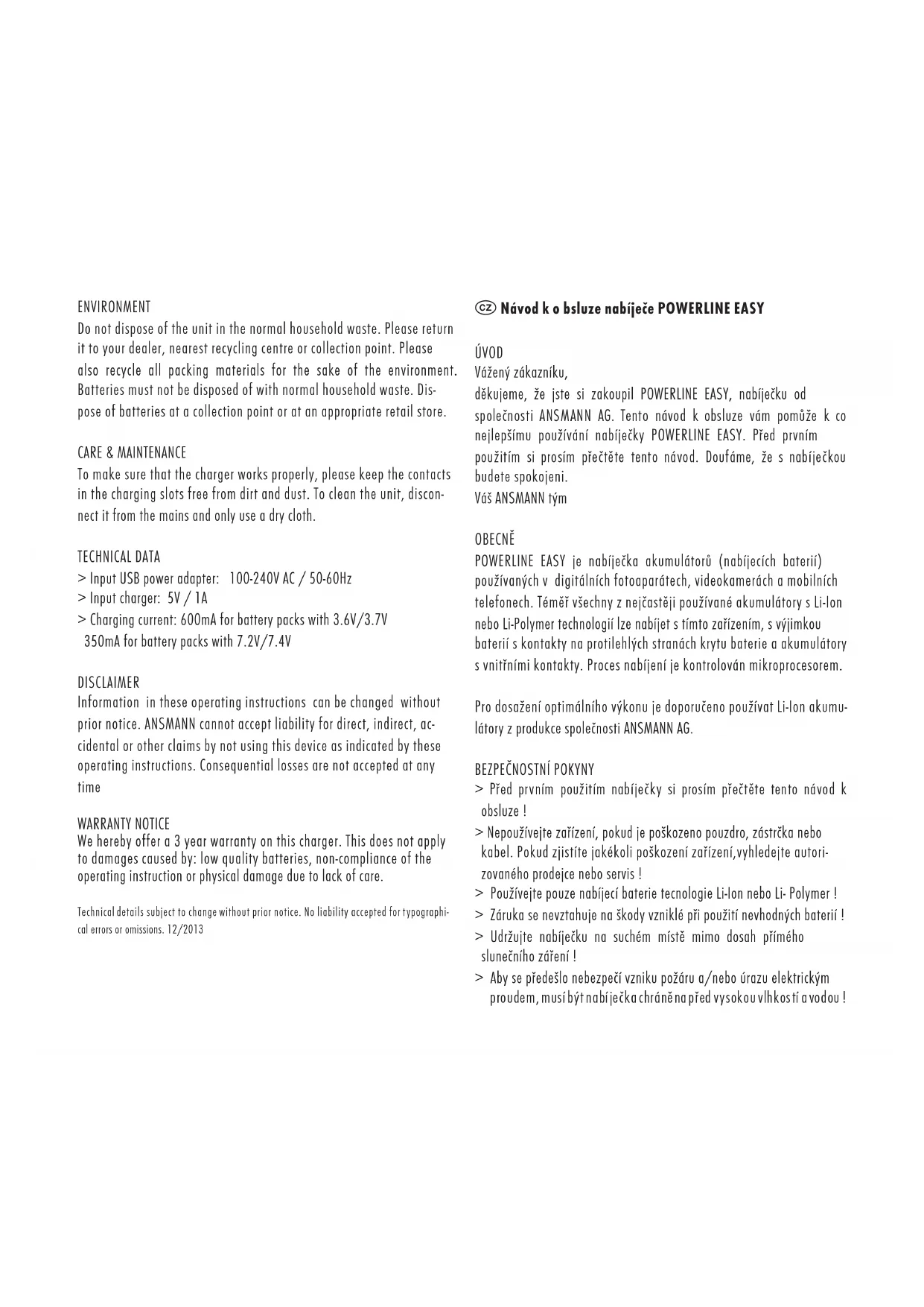 Ujistěte se, že nabíječka funguje správně, udržujte prosím nabíjecí kon- takty bez nečistot a prachu. K čištění přístroje používejte pouze suchý hadřík. Údržbu provádějte pokud je zařízení odpojeno z elektrické sítě. TECHNICKÉ ÚDAJE > Vstup USB napájecí adaptér: 100-240V AC / 50-60Hz > Vstup nabíječka: 5V / 1A > Nabíjecí proud: 600mA pro akumulátory 3.6V/3.7V 350mA pro akumulátory 7.2V/7.4V UPOZORNĚNÍ Informace v tomto návodu mohou být změněny bez předchozího upozornění. Společnost ANSMANN AG nepřijímá odpovědnost za přímé, nepřímé, náhodné nebo jiné pohledávky způsobené tím, že toto zařízení funguje odlišně od návodu k obsluze. Následné ztráty nejsou akceptovány nikdy. ZÁRUKA Výrobce dává 3-letou záruku na nabíječku. Záruka se nevztahuje na škody způsobené akumulátory nižší kvality, nedodržením tohoto návo- du k obsluze nebo fyzickým poškozením v důsledku nedostatku péče. Technické údaje mohou být změněny bez předchozího upozornění. Neručíme za tiskové chyby nebo opomenutí. 12/2013E Manual de Instrucciones POWERLINE EASY PRÓLOGO Estimado cliente, Gracias por comprar el cargador POWERLINE EASY de ANSMANN. Este manual de instrucciones le ayudará a obtener lo mejor de su POWER- LINE EASY. Por favor, lea atentamente estas instrucciones antes de su uso. Esperamos que usted sea feliz con su nuevo cargador. Su equipo ANSMANN GENERAL La POWERLINE EASY es un cargador de baterías usadas en cámaras digitales, videocámaras y teléfonos móviles. Casi todas las baterías más comunes con Li-Ion o la tecnología Li-Polymer se pueden cargar con este dispositivo, a excepción de los paquetes de baterías con con- tactos en los lados opuestos de la caja de la batería y las baterías con contactos internos. Un microprocesador supervisa automáticamente el proceso de carga. Para un rendimiento óptimo se recomienda el uso de paquetes de ba- terías de iones de litio de ANSMANN.