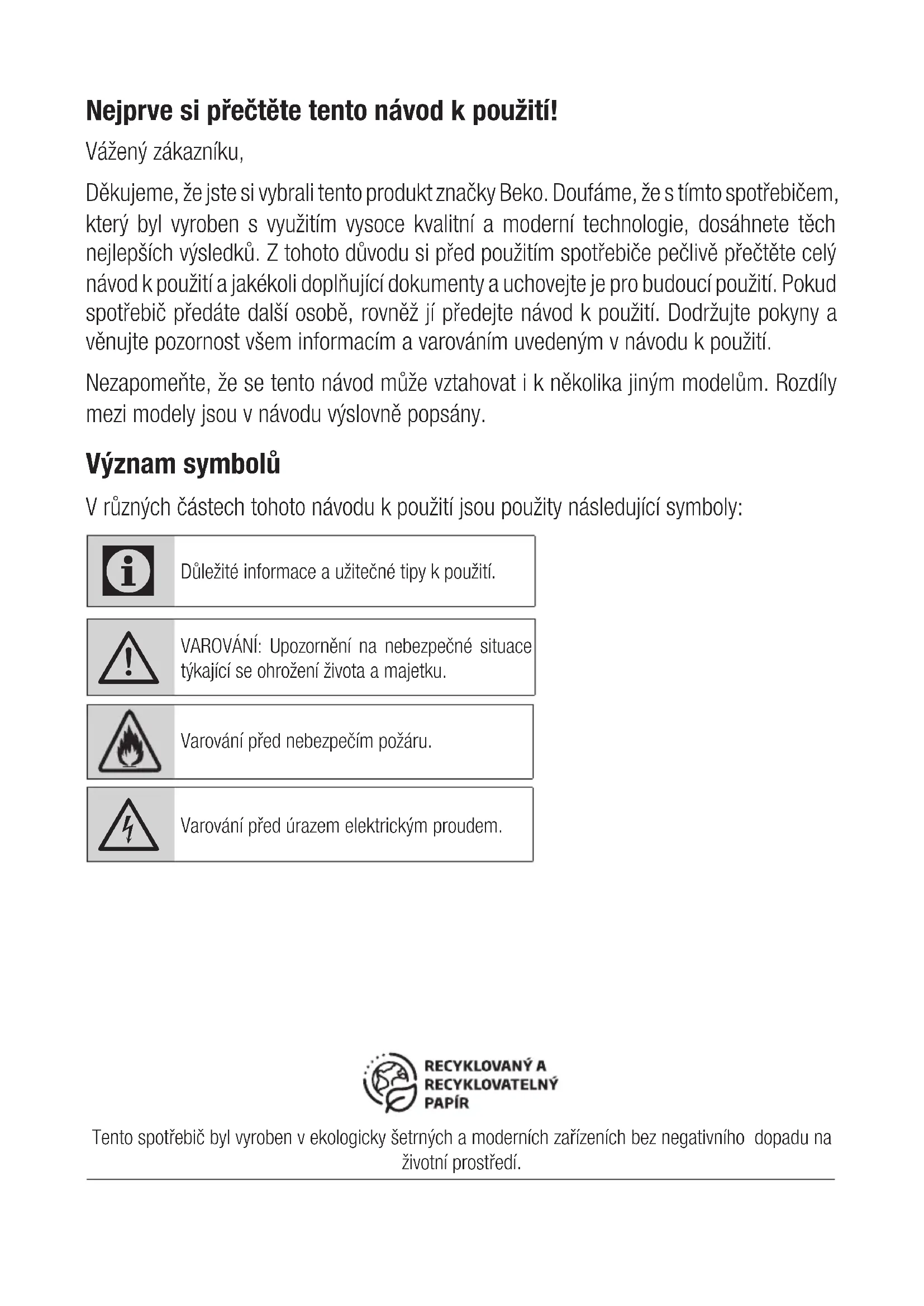- Výrobky značky Beko splňují platné bezpečnostní normy; proto v případě jakéhokoli poškození spotřebiče nebo napájecího ka- belu musí být provedena oprava nebo výměna prodejcem, servis- ním centrem nebo odborníkem z autorizovaného servisu, aby se předešlo nebezpečí. Chybná nebo neodborná oprava může být nebezpečná pro uživatele.