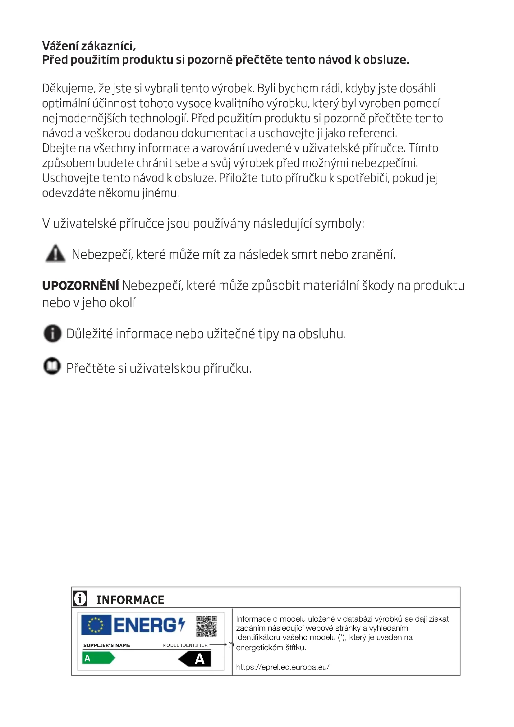 Informace o modelu uložené v databázi výrobků se dají získat zadáním následující webové stránky a vyhledáním identifikátoru vašeho modelu (*), který je uveden na energetickém štítku.https://eprel.ec.europa.eu/