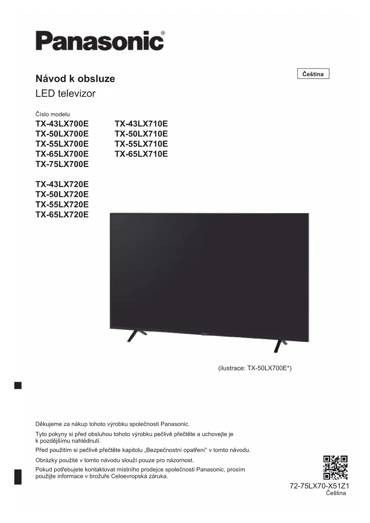 Licence OSS Tento výrobek obsahuje následující software: (1) Software vyvinutý nezávisle společností Panasonic Entertainment & Communication Co., Ltd. nebo pro ni, (2) Software vlastněný třetí stranou a licencovaný společnosti Panasonic Entertainment & Communication Co., Ltd., (3) Software licencovaný pod GNU General Public License, verze 2.0 (GPL V2.0), (4) Software licencovaný pod GNU LESSER General Public License, verze 2.1 (LGPL V2.1) a/nebo (5) Open source software jiný než software licencovaný pod licencí GPL V2.0 a/nebo LGPL V2.1. Software zařazený do kategorií (3) – (5) je šířen s tím, že bude užitečný, ale BEZ JAKÉKOLIV ZÁRUKY, dokonce i bez předpokládané záruky PRODEJNOSTI nebo VHODNOSTI PRO URČITÝ ÚČEL. Přečtěte si prosím jejich podrobné podmínky [Systém > Nastavení > Licence OSS] Nejméně tři (3) roky od dodání tohoto výrobku poskytne společnost Panasonic jakékoli třetí straně, která nás kontaktuje na níže uvedených kontaktních údajích, za poplatek nepřesahující naše náklady na fyzické provedení distribuce zdrojového kódu, kompletní strojově čitelnou kopii příslušného zdrojového kódu krytého licencemi GPL V2.0, LGPL V2.1 nebo jinými licencemi s povinností tak učinit, jakož i příslušné oznámení o autorských právech k nim. Kontakt: osd-cd-request@gg.jp.panasonic.comLikvidace použitých zařízení a baterií Jen pro státy Evropské unie a země se systémem recyklace Tyto symboly na výrobcích, obalech nebo v průvodní dokumentaci znamenají, že použitá elektrická a elektronická zařízení a baterie nepatří do běžného domácího odpadu. Aby byla zajištěna správná likvidace, recyklace a opětovné použití, odevzdejte tato zařízení a použité baterie na místech k tomu určených v souladu s platnými národnímu předpisy. Správnou likvidací zařízení a baterií pomůžete šetřit cenné suroviny a předcházet možným negativním dopadům na lidské zdraví a na životní prostředí. O další informace o sběru a recyklaci požádejte místní úřady. Za nesprávnou likvidaci tohoto odpadu můžete být potrestáni v souladu s vnitrostátními právními předpisy. Poznámka k symbolu baterie (symbol dole): Tento symbol může být použit v kombinaci s chemickým symbolem. V tomto případě splňuje požadavky směrnice pro chemickou látku obsaženou v baterii. Záznamy zákazníka Číslo modelu a výrobní číslo tohoto výrobku lze vyhledat na jeho zadním panelu. Toto výrobní číslo byste si měli zapsat na níže vyhrazené místo a uschovat si tuto knihu včetně dokladu o zakoupení jako stálý záznam o zakoupení tohoto přístroje za účelem identifikace při odcizení nebo ztrátě a také kvůli záručním službám. Číslo modelu Výrobní číslo Panasonic Entertainment & Communication Co., Ltd. Web: http://www.panasonic.com © Panasonic Entertainment & Communication Co., Ltd. 2022 72-75LX70-X51Z1 Čeština Vytištěno v Číně72-75LX70-X51Z1 Model br. TX-43LX700E TX-50LX700E TX-55LX700E TX-65LX700E TX-75LX700E TX-43LX720E TX-50LX720E TX-55LX720E TX-65LX720E TX-43LX710E TX-50LX710E TX-55LX710E TX-65LX710E Upute za rad LED TV Hrvatski Hvala vam što ste kupili ovaj Panasonic proizvod. Molimo pažljivo pročitajte ove upute prije korištenja ovog proizvoda i sačuvajte ih za buduću upotrebu. Prije uporabe pažljivo pročitajte "Sigurnosne mjere" u ovom priručniku. Slike prikazane u ovom priručniku služe samo u ilustrativne svrhe. Molimo pogledajte Paneuropsku jamstvenu karticu ako se trebate obratiti svom lokalnom Panasonic prodavaču za pomoć. (slika: TX-50LX700E*) HrvatskiHrvatski