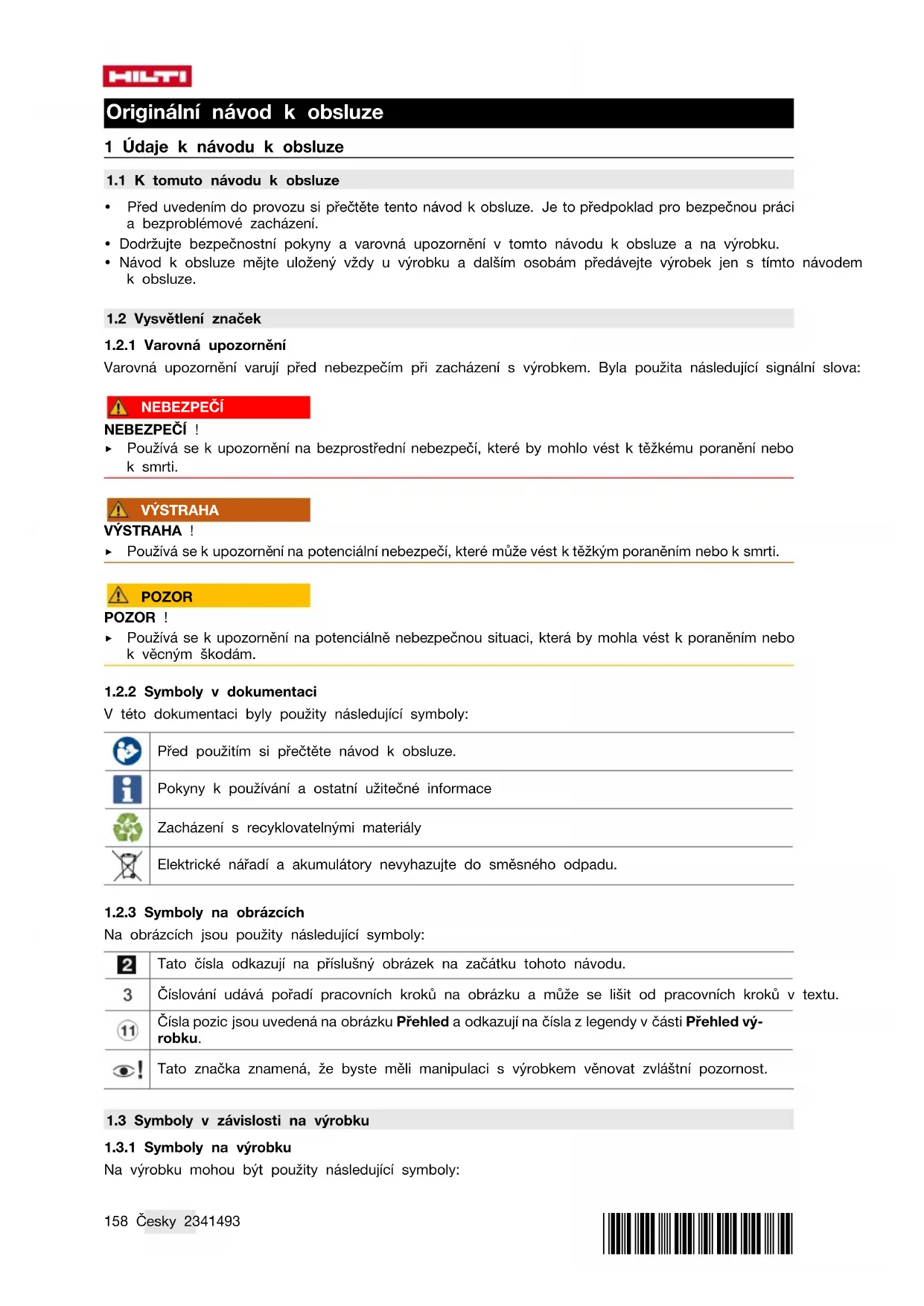 - Po ošetřování a údržbě nasaďte všechna ochranná zařízení a zkontrolujte, zda bezvadně fungují. Pro bezpečný provoz používejte pouze originální náhradní díly a spotřební materiál. Náhradní díly, spotřební materiál a příslušenství schválené Hilti pro váš výrobek najdete v Hilti Store nebo na: www.hilti.group