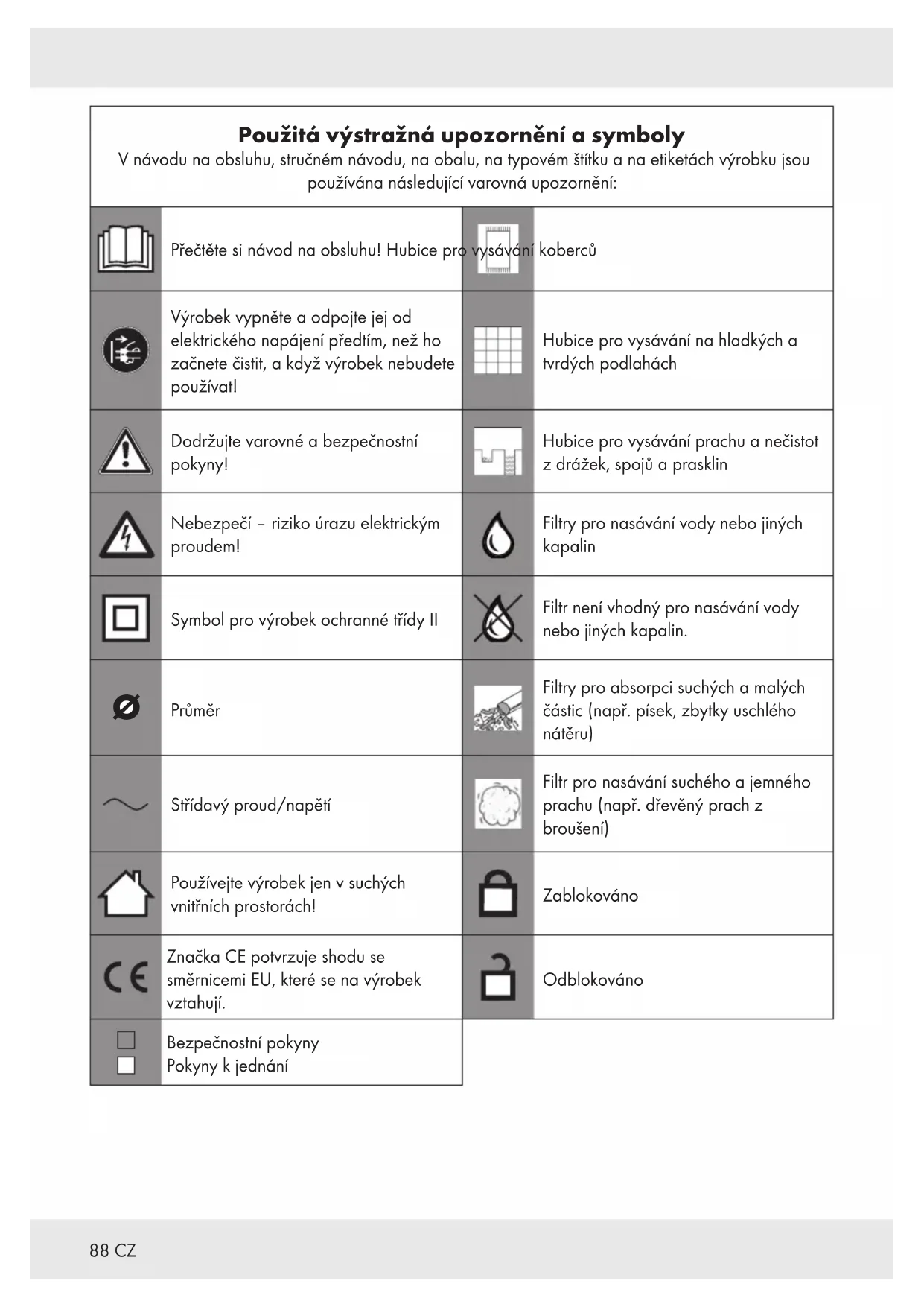 Průměr Filtry pro absorpci suchých a malých částic (např. písek, zbytky uschlého nátěru) Střídavý proud/napětí Filtr pro nasávání suchého a jemného prachu (např. dřevěný prach z broušení) Používejte výrobek jen v suchých vnitřních prostorách! Zablokováno Značka CE potvrzuje shodu se směrnicemi EU, které se na výrobek vztahují. Odblokováno Bezpečnostní pokyny Pokyny k jednání89CZ