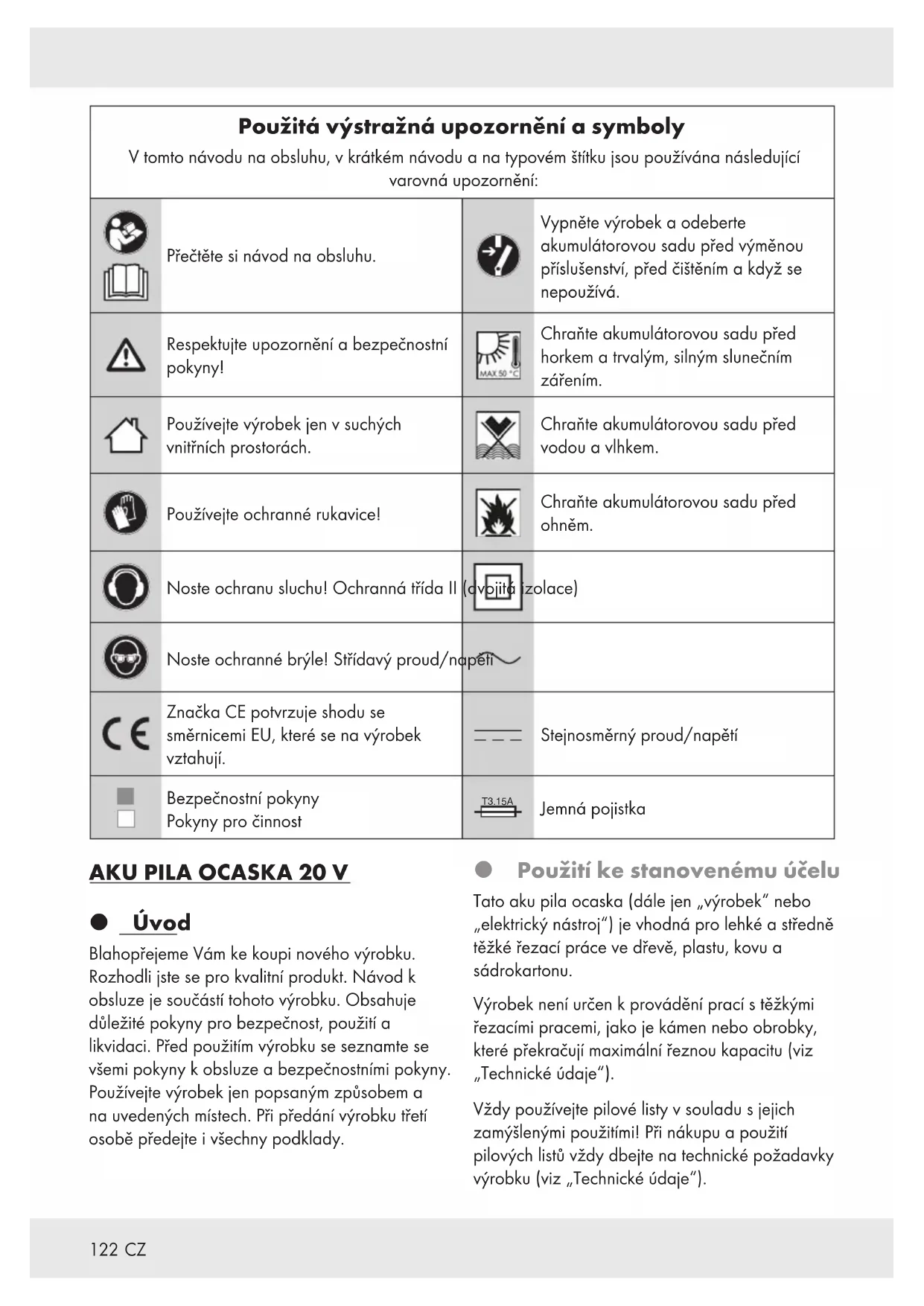Úvod Blahopřejeme Vám ke koupi nového výrobku. Rozhodli jste se pro kvalitní produkt. Návod k obsluze je součástí tohoto výrobku. Obsahuje důležité pokyny pro bezpečnost, použití a likvidaci. Před použitím výrobku se seznamte se všemi pokyny k obsluze a bezpečnostními pokyny. Používejte výrobek jen popsaným způsobem a na uvedených místech. Při předání výrobku třetí osobě předejte i všechny podklady. Použití ke stanovenému účelu Tato aku pila ocaska (dále jen „výrobek“ nebo „elektrický nástroj“) je vhodná pro lehké a středně těžké řezací práce ve dřevě, plastu, kovu a sádrokartonu. Výrobek není určen k provádění prací s těžkými řezacími pracemi, jako je kámen nebo obrobky, které překračují maximální řeznou kapacitu (viz „Technické údaje“). Vždy používejte pilové listy v souladu s jejich zamýšlenými použitími! Při nákupu a použití pilových listů vždy dbejte na technické požadavky výrobku (viz „Technické údaje“).123