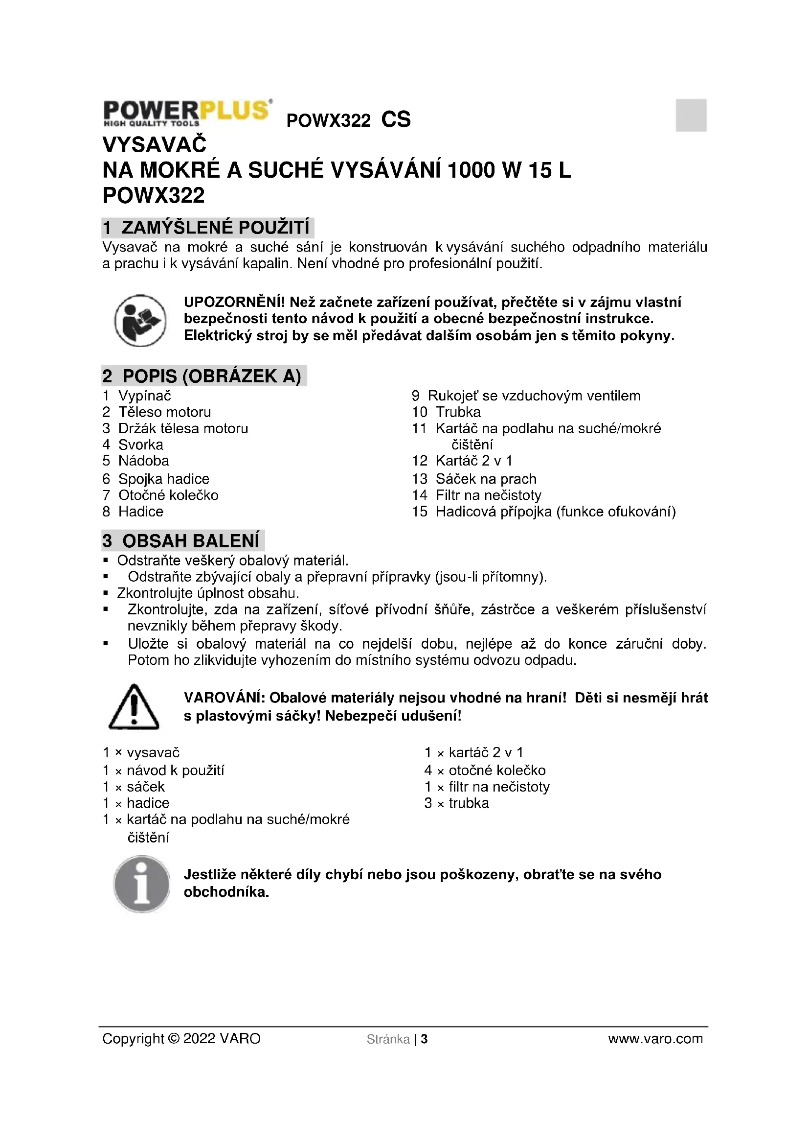 - Neukládejte jej v plastových pytlích, ve kterých by se hromadila vlhkost.POWX322 CS Copyright © 2022 VARO Stránka | 9 www.varo.com 13 ZÁRUKA