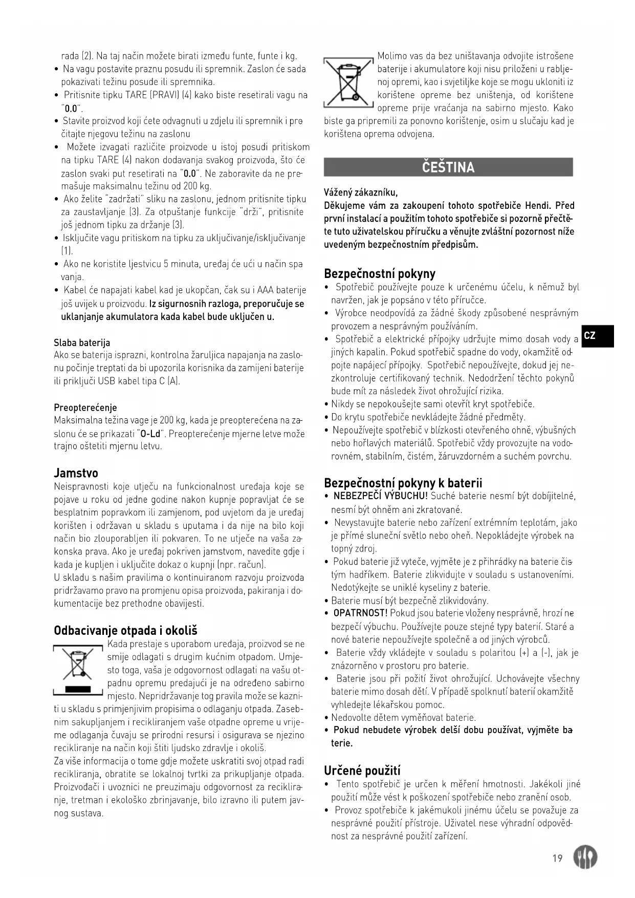 - Tento spotřebič je určen k měření hmotnosti. Jakékoli jiné použití může vést k poškození spotřebiče nebo zranění osob.