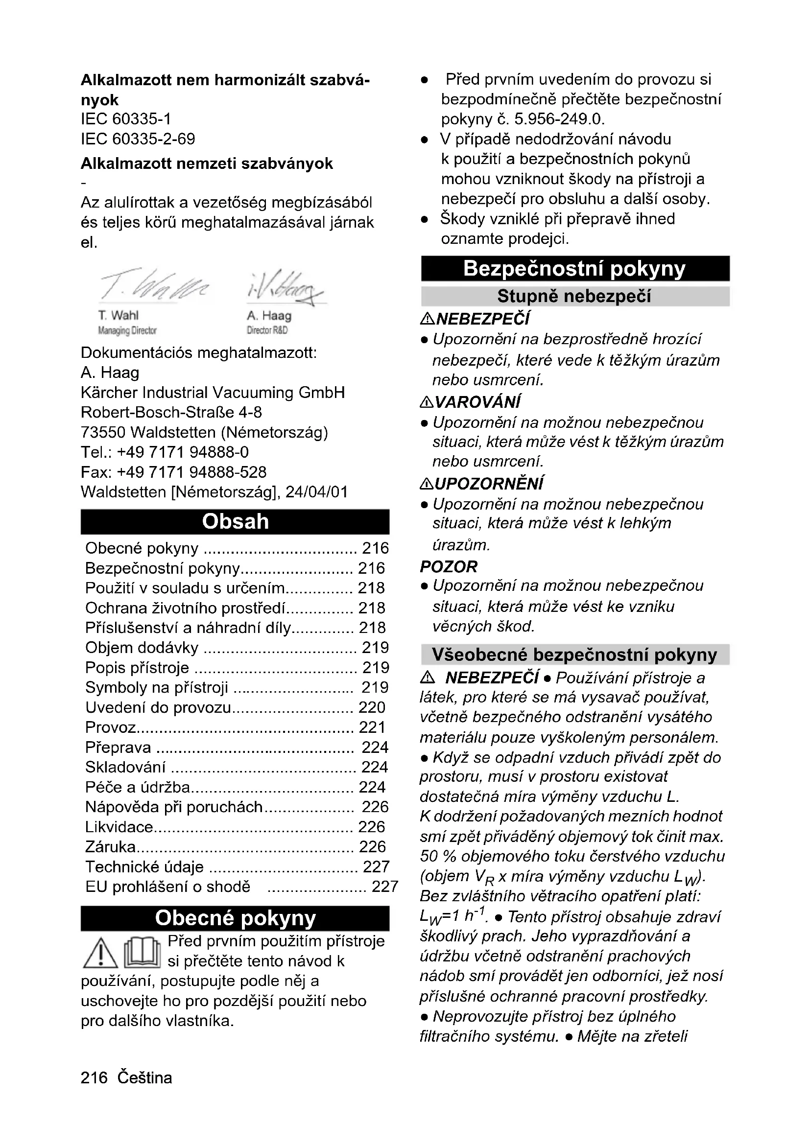 Az alulírottak a vezetőség megbízásából és teljes körű meghatalmazásával járnak el. Dokumentációs meghatalmazott: A. Haag Kärcher Industrial Vacuuming GmbH Robert-Bosch-Straße 4-8 73550 Waldstetten (Németország) Tel.: +49 7171 94888-0 Fax: +49 7171 94888-528 Waldstetten [Németország], 24/04/01 Obsah Obecné pokyny Před prvním použitím přístroje si přečtěte tento návod k používání, postupujte podle něj a uschovejte ho pro pozdější použití nebo pro dalšího vlastníka. ● Před prvním uvedením do provozu si bezpodmínečně přečtěte bezpečnostní pokyny č. 5.956-249.0. ● V případě nedodržování návodu k použití a bezpečnostních pokynů mohou vzniknout škody na přístroji a nebezpečí pro obsluhu a další osoby. ● Škody vzniklé při přepravě ihned oznamte prodejci. Bezpečnostní pokyny Stupně nebezpečí NEBEZPEČÍ ● Upozornění na bezprostředně hrozící nebezpečí, které vede k těžkým úrazům nebo usmrcení. 몇 VAROVÁNÍ ● Upozornění na možnou nebezpečnou situaci, která může vést k těžkým úrazům nebo usmrcení. 몇 UPOZORNĚNÍ ● Upozornění na možnou nebezpečnou situaci, která může vést k lehkým úrazům. POZOR ● Upozornění na možnou nebezpečnou situaci, která může vést ke vzniku věcných škod. Všeobecné bezpečnostní pokyny NEBEZPEČÍ ● Používání přístroje a látek, pro které se má vysavač používat, včetně bezpečného odstranění vysátého materiálu pouze vyškoleným personálem. ● Když se odpadní vzduch přivádí zpět do prostoru, musí v prostoru existovat dostatečná míra výměny vzduchu L. K dodržení požadovaných mezních hodnot smí zpět přiváděný objemový tok činit max. 50 % objemového toku čerstvého vzduchu (objem V