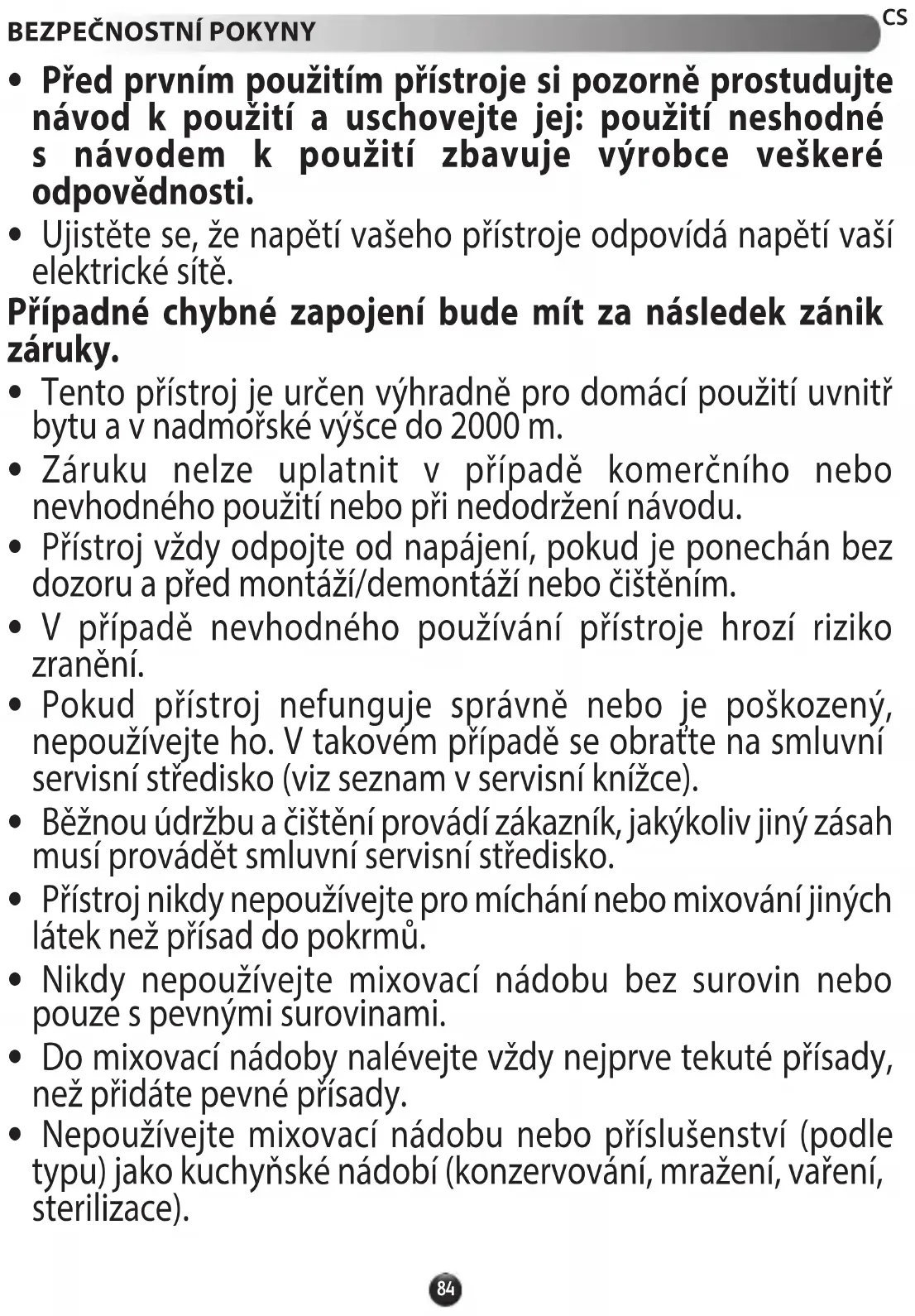 - Přístroj nikdy nepoužívejte pro míchání nebo mixování jiných látek než přísad do pokrmů.