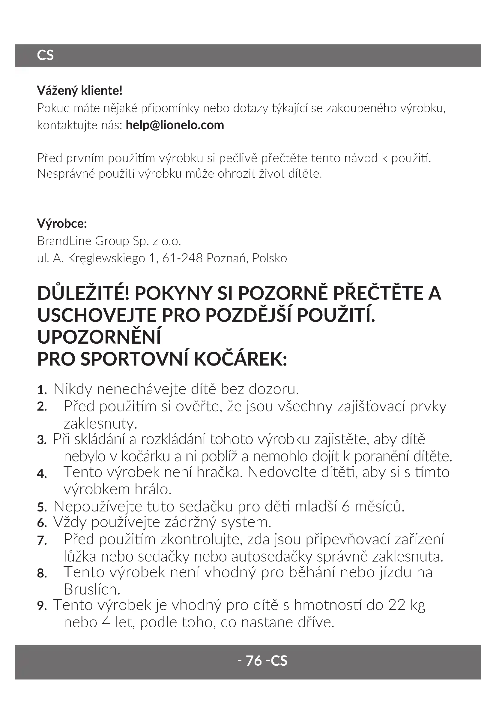 Vážený kliente! Pokud máte nějaké připomínky nebo dotazy týkající se zakoupeného výrobku, kontaktujte nás: help@lionelo.com Před prvním použim výrobku si pečlivě přečtěte tento návod k použi. Nesprávné použi výrobku může ohrozit život dítěte. Výrobce: BrandLine Group Sp. z o.o. ul. A. Kręglewskiego 1, 61-248 Poznań, Polsko DŮLEŽITÉ! POKYNY SI POZORNĚ PŘEČTĚTE A USCHOVEJTE PRO POZDĚJŠÍ POUŽITÍ. UPOZORNĚNÍ PRO SPORTOVNÍ KOČÁREK: