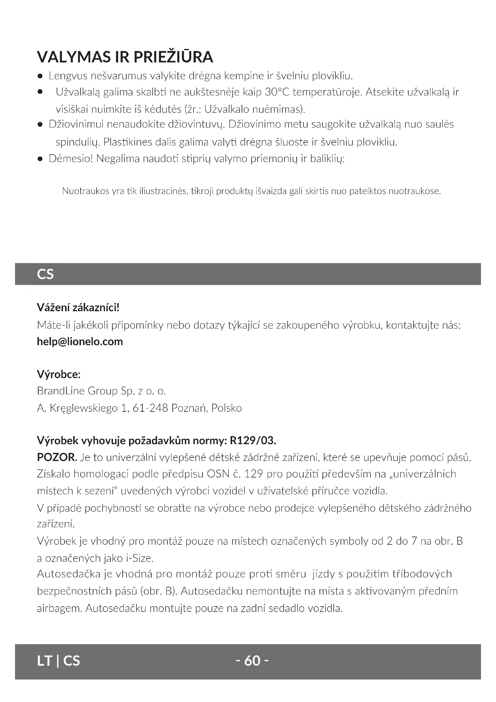 Vážení zákazníci! Máte-li jakékoli připomínky nebo dotazy týkající se zakoupeného výrobku, kontaktujte nás: help@lionelo.com Výrobce: BrandLine Group Sp. z o. o. A. Kręglewskiego 1, 61-248 Poznań, Polsko Výrobek vyhovuje požadavkům normy: R129/03. POZOR. Je to univerzální vylepšené dětské zádržné zařízení, které se upevňuje pomocí pásů. Získalo homologaci podle předpisu OSN č. 129 pro použi především na „univerzálních místech k sezení“ uvedených výrobci vozidel v uživatelské příručce vozidla. V případě pochybnos se obraťte na výrobce nebo prodejce vylepšeného dětského zádržného zařízení. Výrobek je vhodný pro montáž pouze na místech označených symboly od 2 do 7 na obr. B a označených jako i-Size. Autosedačka je vhodná pro montáž pouze pro směru jízdy s použim tříbodových bezpečnostních pásů (obr. B). Autosedačku nemontujte na místa s akvovaným předním airbagem. Autosedačku montujte pouze na zadní sedadlo vozidla. LT | CS‑ 61 ‑ CS VÝSTRAHY:
