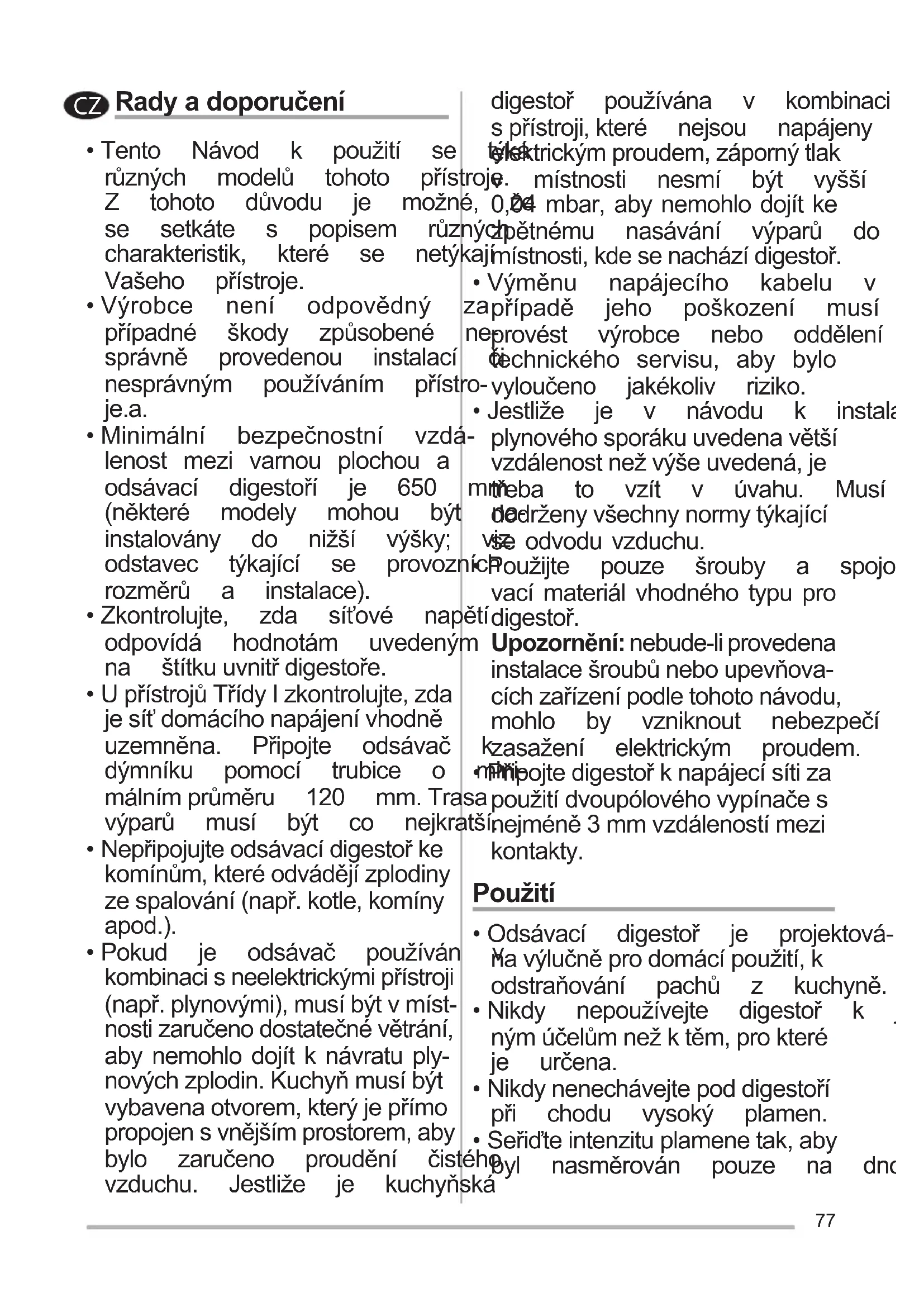 - Pokud je odsávač používán v kombinacisneelektrickýmipřístroji (např.plynovými),musíbýtvmíst- nostizaručenodostatečnévětrání, aby nemohlo dojít k návratu ply- novýchzplodin.Kuchyňmusíbýt vybavenaotvorem,kterýjepřímo propojensvnějšímprostorem,aby bylo zaručeno proudění čistého vzduchu. Jestliže je kuchyňská digestoř používána v kombinaci spřístroji,které nejsou napájeny elektrickýmproudem,zápornýtlak v místnosti nesmí být vyšší než 0,04 mbar, aby nemohlo dojít ke zpětnému nasávání výparů do místnosti,kdesenacházídigestoř.