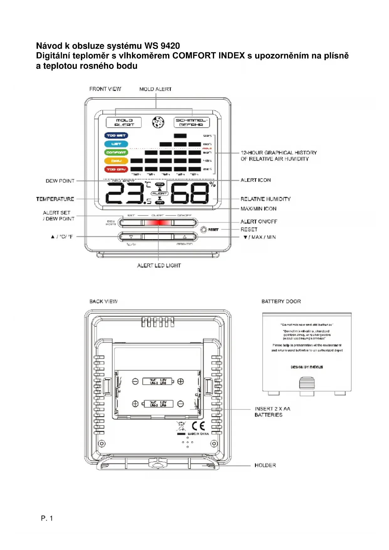 Upozornění Tato jednotka je k použití pouze v interiéru. Nevystavujte přístroj nadměrné síle nebo nárazu. Nevystavujte přístroj extrémním teplotám, přímému slunečnímu záření, prachu nebo vlhkosti. Nikdy neponořujte do vody. Vyhněte se kontaktu s korozívními materiály. Nevhazujte tento přístroj do ohně, mohl by explodovat. Neotevírejte vnitřní pouzdro nebo manipulovat s jakýmikoli součástí této jednotky. Baterie a bezpečnostní varování Používat pouze alkalické baterie. Nepoužívejte dobíjecí baterie. Baterie vkládejte správně odpovídající polaritou (+/-). Vždy vyměňte kompletní sadu baterií. Nikdy nemíchejte použité a nové baterie. Okamžitě odstraňte vybité baterie. Baterie vyjměte, když není zařízení v provozu. Nenabíjejte a nevhazujte baterie do ohně, mohly by explodovat. Ujistěte se, že jsou baterie uloženy mimo dosah kovových předmětů, neboť kontakt může způsobit zkrat.P. 6 Nevystavujte baterie extrémním teplotám nebo vlhkosti nebo přímému slunečnímu záření. Ukládejte baterie mimo dosah dětí. Existuje riziko udušení. SPECIFIKACE Rozsah teplot 0 °C až +50 °C Tolerance +/- 1 °C Rozsah relativní vlhkosti 20 % – 95 % Tolerance +/- 5 % Teplotní rozlišení 0,1 °C Rozlišení relativní vlhkosti 1 %