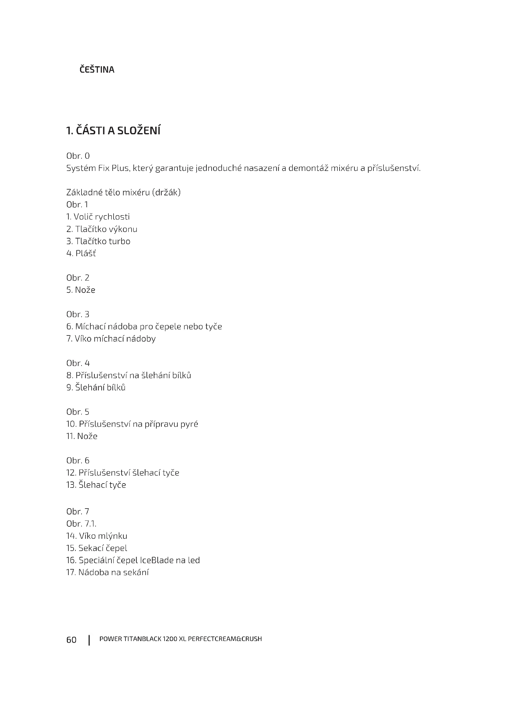 ČEŠTINA vejce nebo cukr. Nepokoušejte se rozšlehat tvrdší směsi, jako je margarín, protože to může poškodit tyče. Připojte tyče k připojení. Umístěte rukojeť mixéru dovnitř příslušenství a zaklapněte ji kliknutím. Vložte jídlo do nádoby. Nešlehejte současně více než 6 vaječných bílků nebo 1 000 ml krému. Nedovolte, aby kapalina stékala nad tyčemi. Připojte přístroj a stiskněte hlavní vypínač. Po použití spotřebič odpojte a rozeberte. Příslušenství na přípravu pyré Obr. 5 Vložte jídlo do mísy nebo dostatečně velké nádoby. Zapojte přístroj do elektrického přívodu. Vyberte nastavení na nastavitelném pečivu. Ve voliči rychlosti vyberte vysokou rychlost. Vložte příslušenství na pyré do přísad a stisknutím ovládacího tlačítka je spojte. Příslušenstvím jemně pohybujte ingrediencemi, dokud nedosáhnete požadované textury. Vypněte motor uvolněním tlačítka, vyjměte příslušenství z kontejneru a odpojte spotřebič. Sekání o objemu 600 ml Obr. 7/7.1 Vhodné pro sekání masa, sýrů, zeleniny, koření, chleba, sušenek a ořechů. Odstraňte všechny pecky a kosti, které mohou být v připravovaných potravinách, a nakrájejte je na kousky o tloušťce 1 až 2 cm. Čepele na sekání ledu nebo speciální IceBlade vložte do nádoby přes čep. Do nádoby přidejte jídlo. Nasaďte víčko a otočte jej. Umístěte rukojeť směšovače a otočením ji zacvakněte. Ujistěte se, že držíte nádobu pevně a připojte zařízení k elektrické energii. Potom stiskněte tlačítko zapnutí. Po použití zařízení jej odpojte, rozeberte součásti a řádně je umyjte. Tlačítko turbo Stisknutím tohoto tlačítka během používání mixéru dosáhnete maximální rychlosti a výkonu. Varování: mixér může být přehřátý, pokud tuto funkci používáte delší dobu. Volič rychlosti Otáčením voliče změňte rychlost lopatek podle svých potřeb. Srovnávací tabulkaPOWER TITANBLACK 1200 XL PERFECTCREAM&CRUSH