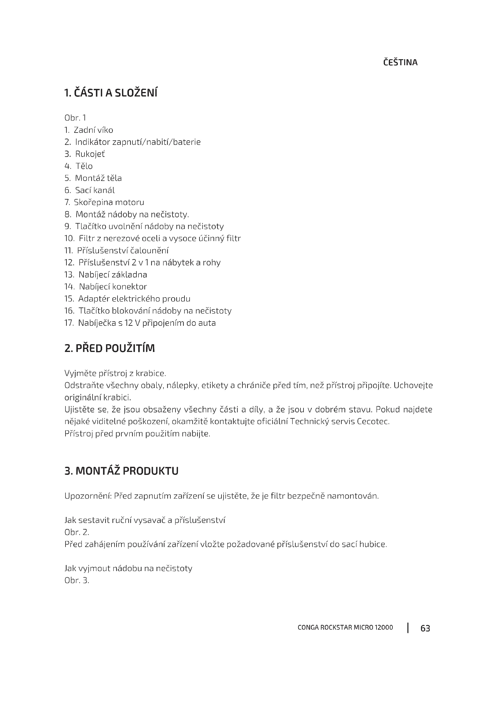 Tento produkt má záruku 2 roky od data zakoupení v případě, že zákazník disponuje fakturou nebo dokladem o koupi a produkt je v perfektním stavu a nakládá se s ním adekvátním způsobem tak, jak je uvedeno s v tomto návodu na použití. Záruka nezahrnuje: Pokud byl produkt používán nad svoji kapacitu anebo užitnost, byl špatně používán, utrpěl náraz, byl vystaven vlhkosti, ponořen do tekutiny nebo jiné korozivní substance, a jakoukoli vinu připsatelnou spotřebiteli. Pokud byl produkt rozmontován, modifikován anebo opravován servisem neautorizovaným oficiálním servisem Cecotec. Pokud byl problém zaviněn normálním používáním a opotřebením součástek. Záruční servis kryje veškeré defekty zaviněné během výroby po dobu 2 let na základě platné legislativy, s výjimkou spotřebních dílů. V případě špatného zacházení ze strany spotřebitele není záruční servis odpovědný za opravu. Pokud byste někdy zjistili s přístrojem problém nebo máte nějaký dotaz, spojte se okamžitě s oficiálním Technickým asistenčním servisem Cecotec na telefonním čísle +34 96 321 07 28. 05561_Conga Rockstar Micro 12000_Manual_YV_01200817.indd 6705561_Conga Rockstar Micro 12000_Manual_YV_01200817.indd 67 17/8/20 15:0817/8/20 15:08Fig./Img./Abb. / Rys. / Obr. 1