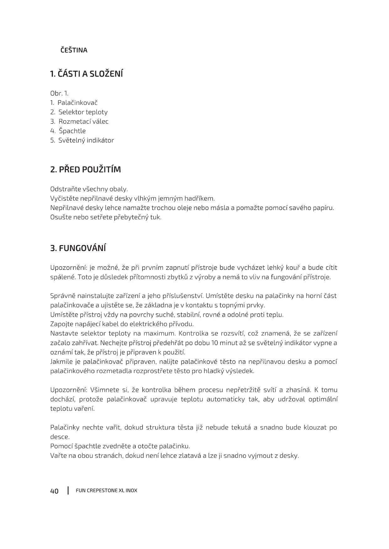 Upozornění: je možné, že při prvním zapnutí přístroje bude vycházet lehký kouř a bude cítit spálené. Toto je důsledek přítomnosti zbytků z výroby a nemá to vliv na fungování přístroje. Správně nainstalujte zařízení a jeho příslušenství. Umístěte desku na palačinky na horní část palačinkovače a ujistěte se, že základna je v kontaktu s topnými prvky. Umístěte přístroj vždy na povrchy suché, stabilní, rovné a odolné proti teplu. Zapojte napájecí kabel do elektrického přívodu. Nastavte selektor teploty na maximum. Kontrolka se rozsvítí, což znamená, že se zařízení začalo zahřívat. Nechejte přístroj předehřát po dobu 10 minut až se světelný indikátor vypne a oznámí tak, že přístroj je připraven k použití. Jakmile je palačinkovač připraven, nalijte palačinkové těsto na nepřilnavou desku a pomocí palačinkového rozmetadla rozprostřete těsto pro hladký výsledek. Upozornění: Všimnete si, že kontrolka během procesu nepřetržitě svítí a zhasíná. K tomu dochází, protože palačinkovač upravuje teplotu automaticky tak, aby udržoval optimální teplotu vaření. Palačinky nechte vařit, dokud struktura těsta již nebude tekutá a snadno bude klouzat po desce. Pomocí špachtle zvedněte a otočte palačinku. Vařte na obou stranách, dokud není lehce zlatavá a lze ji snadno vyjmout z desky. 08019_Crepera Fun Crepestone XL Inox_Manual_YV_01200723docx.indd 4008019_Crepera Fun Crepestone XL Inox_Manual_YV_01200723docx.indd 40 24/7/20 12:4824/7/20 12:48FUN CREPESTONE XL INOX