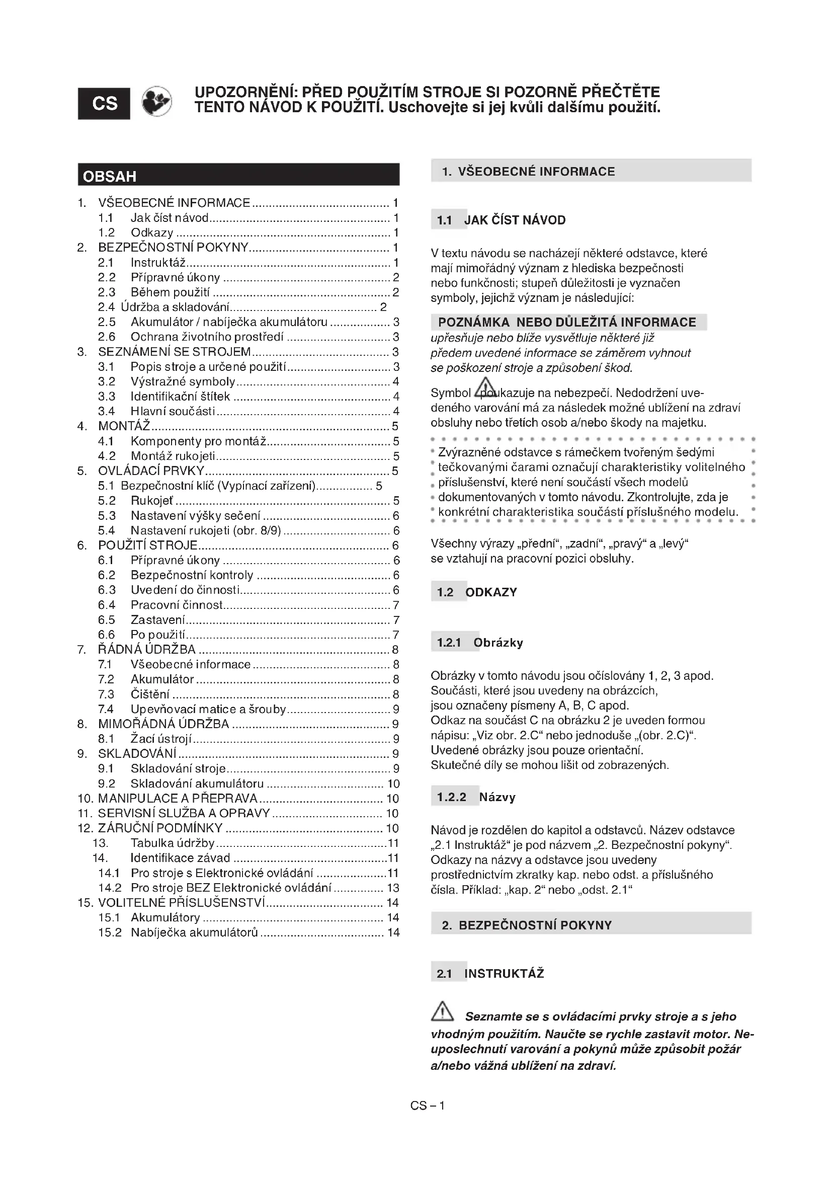 - Při vyřazení stroje z provozu jej nenechávejte volně v přírodě, ale obraťte se na sběrné středisko, které je v souladu s platnými místními předpisy. Neodhazujte elektrická zařízení do domovního odpadu. Podle evropské směrnice 2012/19/EU o odpadu tvořeném elektrickými a elektronickými zařízeními a její aplikace v podobě národních norem musí být elektrická zařízení po skončení své životnosti odevzdána do sběru odděleně za účelem jejich ekokompatibilní recyklace. Když se elektrická zařízení likvidují na smetišti nebo volně v přírodě, škodlivé látky mohou proniknout do podzemních vod a dostat se do potravinového řetězce, čímž mohou poškodit vaše zdraví a narušit životní pohodu. Pro získání podrobnějších informací o likvidaci tohoto výrobku se obraťte na kompetentní organizaci, zabývající se ekologickou likvidací domovního odpadu, nebo na vašeho Prodejce. Po skončení životnosti akumulátorů proveďte jejich likvidaci a věnujte přitom pozornost našemu životnímu prostředí. Akumulátor obsahuje materiál, který je nebezpečný pro vás i pro životní prostředí. Je třeba jej odepnout a zlikvidovat samostatně ve sběrném středisku, které likviduje také akumulátory s ionty lithia. Separovaný sběr použitých výrobků a obalů umožňuje recyklaci materiálů a jejich opětovné použití. Opětovné použití recyklovaných materiálů pomáhá předcházet znečištění životního prostředí a snižuje poptávku po prvotních surovinách.