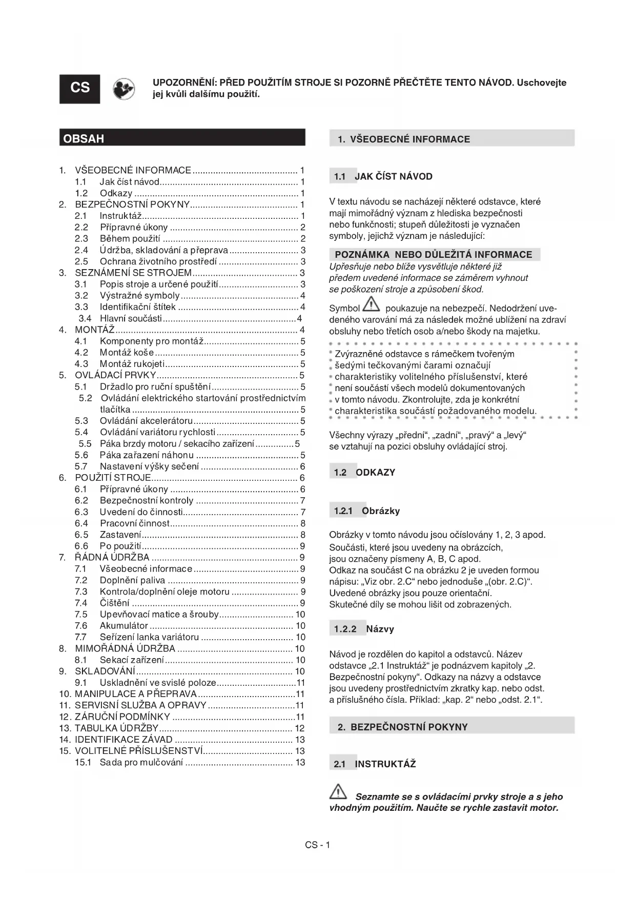 15.1 Sada pro mulčování .......................................... 13CS - 2 Neuposlechnutí varování a pokynů může způsobit požár a/nebo vážná ublížení na zdraví.