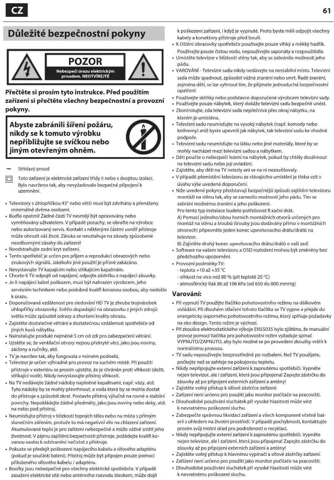 - Televizory s úhlopříčkou 43" nebo větší musí být zdvihány a přenášeny minimálně dvěma osobami.
