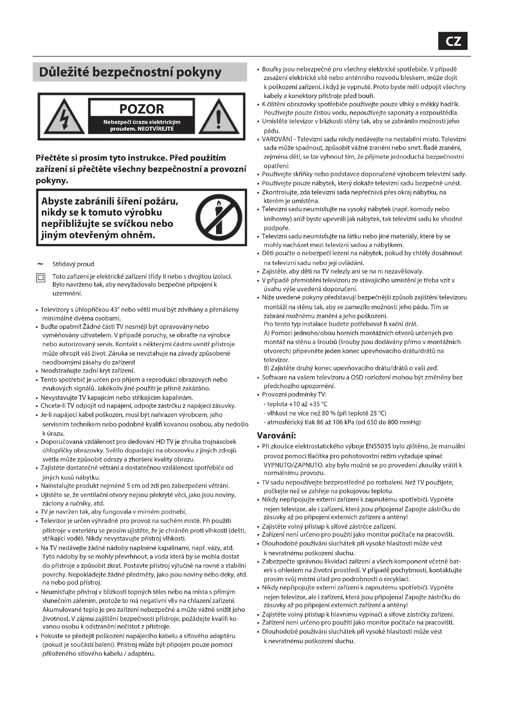 - - valikuline Telerimenüüs navigeerimine Menüü avamiseks vajutage puldil nuppu [MENU]. Menüüsse sisenemiseks vajutage [OK]. Kui soovite mõnda vaikeseadet muuta, kasutage kerimisnuppe (▲/▼/◄/►). Seadete kinnitamiseks vajutage nuppu [OK]. Menüüst väljumiseks vajutage nuppu [EXIT]. Elektrooniline kasutusjuhend Veebijuhendi avamiseks vajutage nuppu [MENU] ja valige seejärel Seaded > Seadistamine > Abiteave. Kaugjuhtimine Vt teleri ekraanile kuvatavat juhendit USB-meediumi taasesituse teatis See teler toetab USB-mäluseadmelt väga erinevate failitüüpide taasesitamist. Andmete turvalisuse huvides on Google aga piiranud toetavate failisüsteemide tüüpe. USB-mäluseadmelt mistahes meedia taasesitamiseks peab USB-mäluseade olema vormindatud failisüsteemile FAT16 või FAT32. NTFS-i ei toetata.CZCZ Důležité bezpečnostní pokyny POZOR Nebezpečí úrazu elektrickýmproudem. NEOTVÍREJTE Přečtěte si prosím tyto instrukce. Před použitím zařízení si přečtěte všechny bezpečnostní aprovozní pokyny. Abyste zabránili šíření požáru, nikdy se k tomuto výrobku nepřibližujte se svíčkou nebo jiným otevřeným ohněm. Střídavý proud Toto zařízení je elektrické zařízení třídy II nebo s dvojitou izolací. Bylo navrženo tak, aby nevyžadovalo bezpečné připojení k uzemnění.