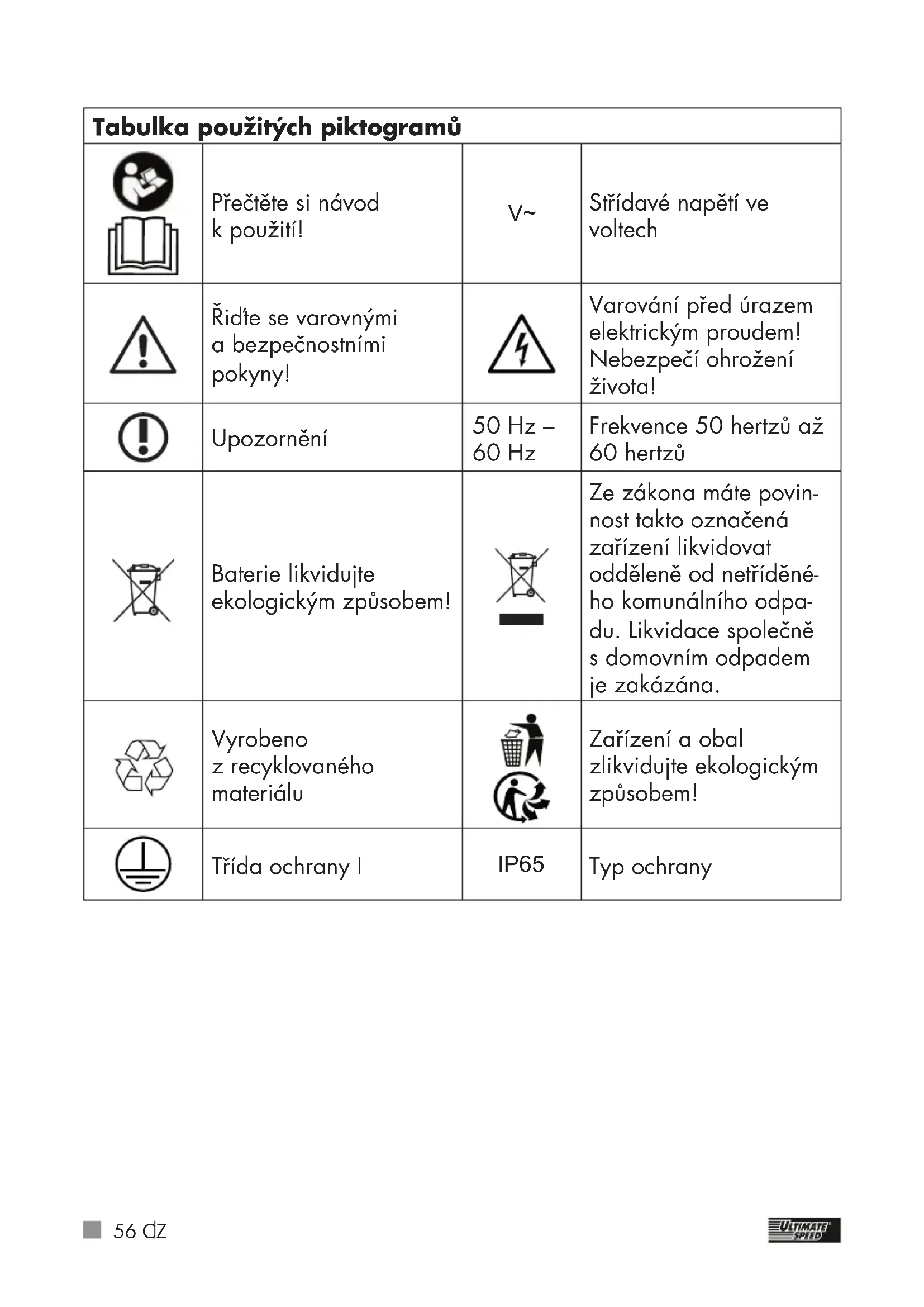 Střídavé napětí ve voltech Řiďte se varovnými abezpečnostními pokyny! Varování před úrazem elektrickým proudem! Nebezpečí ohrožení života! Upozornění 50Hz – 60Hz Frekvence 50hertzů až 60hertzů Baterie likvidujte ekologickým způsobem! Ze zákona máte povin- nost takto označená zařízení likvidovat odděleně od netříděné- ho komunálního odpa- du. Likvidace společně sdomovním odpadem je zakázána. Vyrobeno zrecyklovaného materiálu Zařízení aobal zlikvidujte ekologickým způsobem! Třída ochrany I IP65 Typ ochrany57CZ