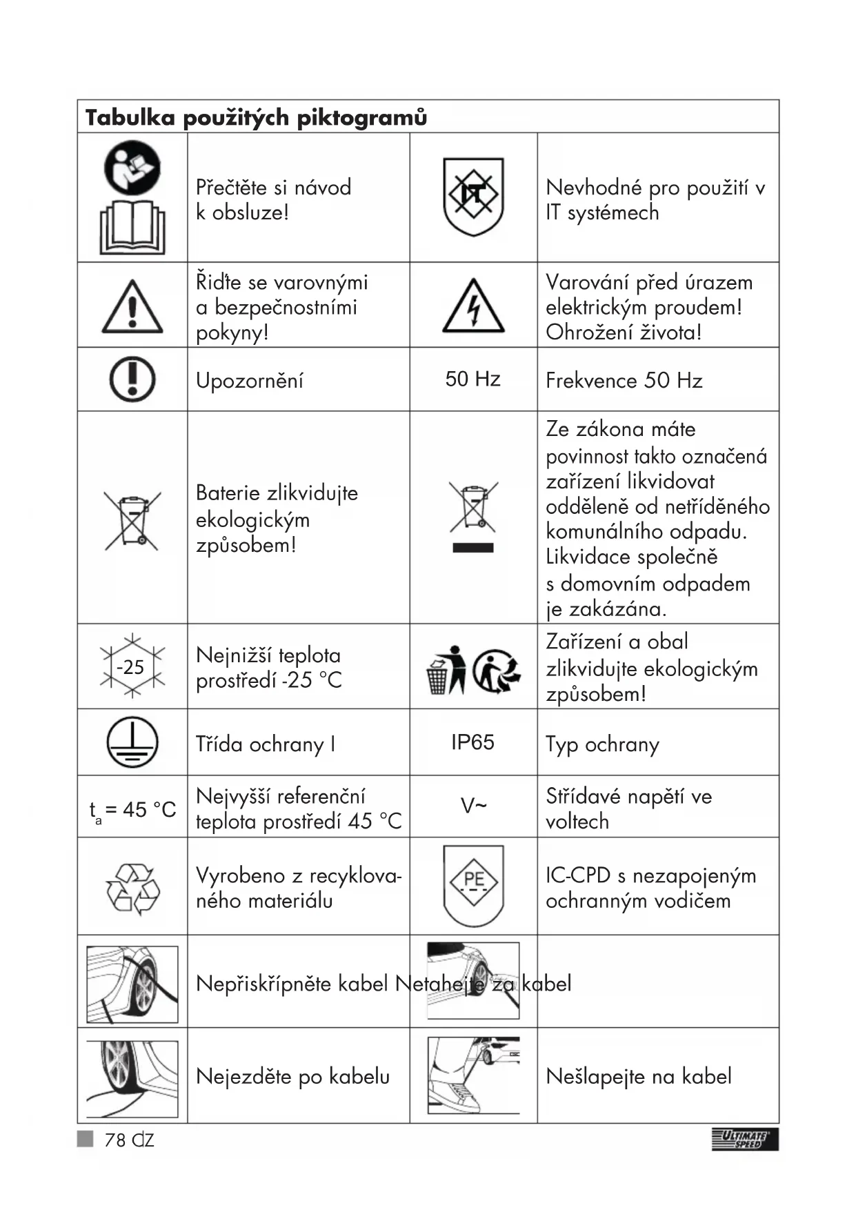 Střídavé napětí ve voltech Vyrobeno zrecyklova- ného materiálu IC-CPD s nezapojeným ochranným vodičem Nepřiskřípněte kabel Netahejte za kabel Nejezděte po kabelu CMC Nešlapejte na kabel79CZ