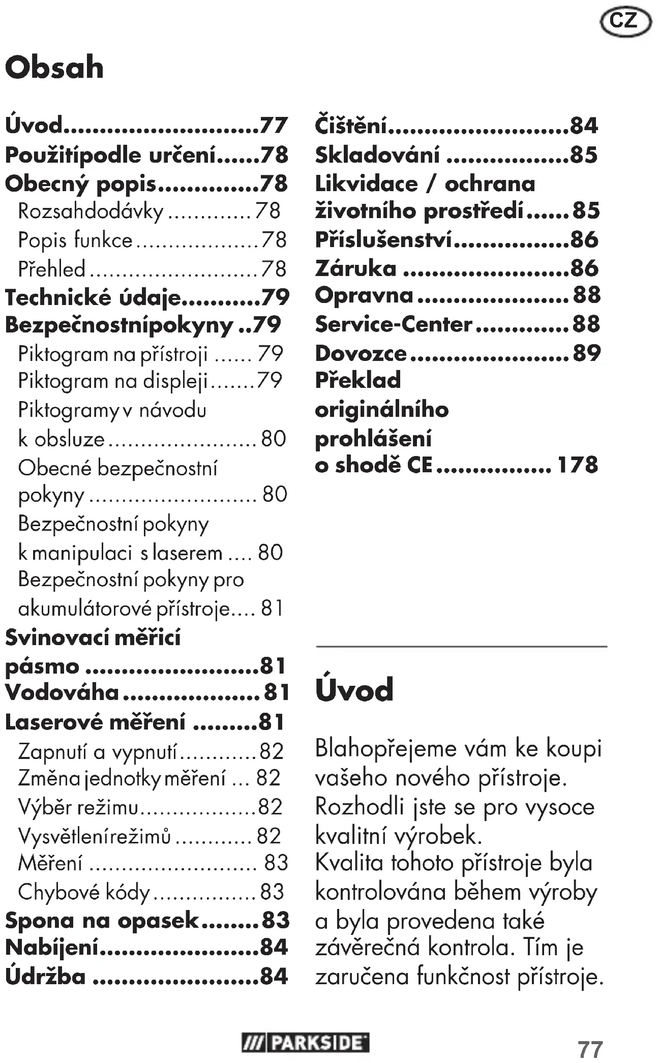 Návod k obsluze je součástí tohoto výrobku. Obsahuje důležité pokyny týkající se bezpečnosti, používání a likvidace. Před použitím výrobku se seznamte se všemi pokyny k obsluze a bezpečnosti. Výrobek používejte jen k popsaným účelům a v rámci uvedených oblastí použití. Návod dobře uschovejte a při předávání výrobku třetímu předejte i všechny podklady. Použitípodle určení Měřicí pásmo s laserem a vodováhou je určeno k měření vzdáleností. Přístroj je určen k použití dospělými. Obsluha nebo uživatel nese zodpovědnost za nehody či škody na jiných osobách nebo jejich majetku. Výrobce neručí zaškody způsobené nesprávným použitím nebo nesprávnou obsluhou. Tento přístroj není vhodný pro ko- merční využití. Při komerčním použití zaniká záruka. Přístroj je vhodný výlučně pro použití v suchých místnostech. Obecný popis Obrázky naleznete na výklopné stránce. Rozsah dodávky Vybalte přístroj a zkontroluj- te, zda je kompletní. - Laserový meric vzdále- nosti s mericím pásmem - nabíjecí kabel USB C - návod k obsluze Obalový materiál zlikviduj- te správně dle předpisů. Popis funkce Funkce ovládacích prvků naleznete vnásledujících popisech. Přehled 1 libela 2 displej 3 tlačítko „Mode“ 4 tlačítko „Laser“ 5 spona na opasek 6 nabíjecí zásuvka 7 nabíjecí kabel USB C 8 konektor USB 9 konektor USB C79