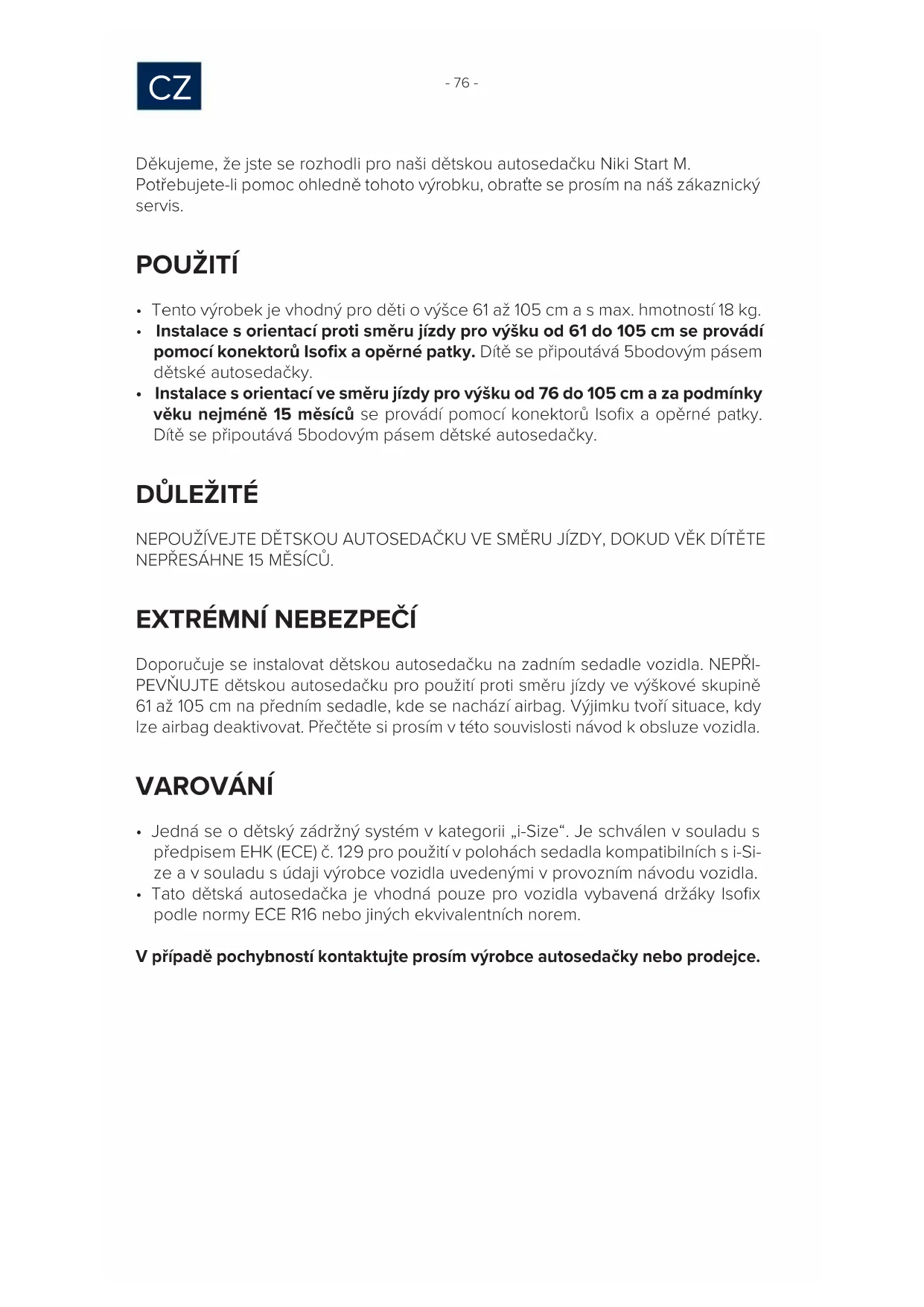 Děkujeme, že jste se rozhodli pro naši dětskou autosedačku Niki Start M. Potřebujete-li pomoc ohledně tohoto výrobku, obraťte se prosím na náš zákaznický servis. POUŽITÍ