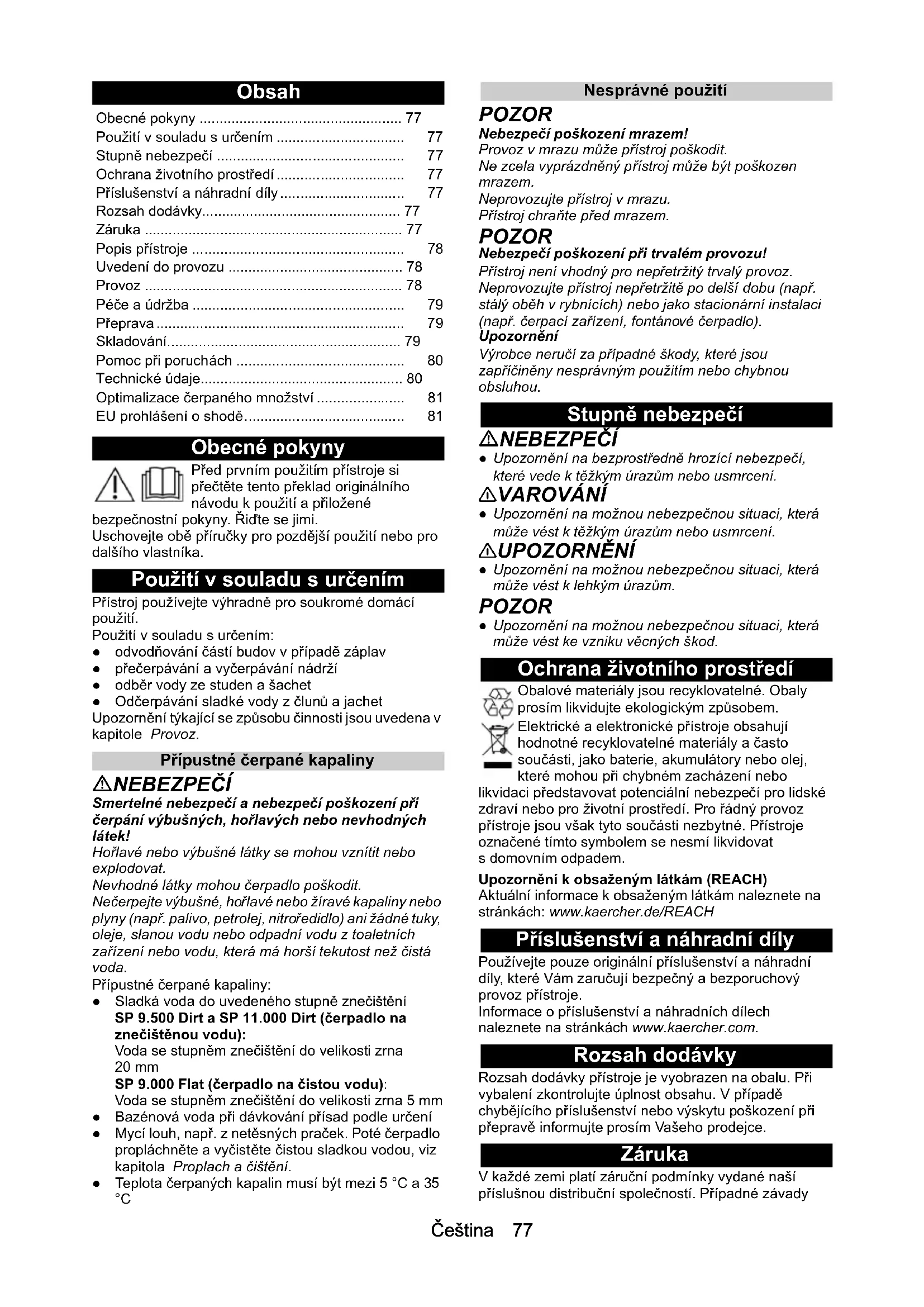 >2,5 >2,5 >2,5 Nyomás (max.) MPa (bar) 0,06 (0,6) 0,06 (0,6) 0,07 (0,7) Szállítási ma- gasság (max.) m667 Bemerülési mélység (max.) m777 A szállítófolya- dék megenge- dett hőmérséklete °C 5...35 5...35 5...35 Az engedélye- zett szállítófo- lyadékok részecskemére- te (max.) mm 5 20 20 Minimális folya- dékmagasság (kézi üzemmód) mm 7 60 60 Maradékfolya- dék szint mm 1 25 25 Súly (tartozé- kok nélkül) kg 3,7 3,8 4,4Čeština 77 Obsah Obecné pokyny Před prvním použitím přístroje si přečtěte tento překlad originálního návodu k použití a přiložené bezpečnostní pokyny. Řiďte se jimi. Uschovejte obě příručky pro pozdější použití nebo pro dalšího vlastníka. Použití v souladu s určením Přístroj používejte výhradně pro soukromé domácí použití. Použití v souladu s určením: ● odvodňování částí budov v případě záplav ● přečerpávání a vyčerpávání nádrží ● odběr vody ze studen a šachet ● Odčerpávání sladké vody z člunů a jachet Upozornění týkající se způsobu činnosti jsou uvedena v kapitole Provoz. Přípustné čerpané kapaliny NEBEZPEČÍ Smertelné nebezpečí a nebezpečí poškození při čerpání výbušných, hořlavých nebo nevhodných látek! Hořlavé nebo výbušné látky se mohou vznítit nebo explodovat. Nevhodné látky mohou čerpadlo poškodit. Nečerpejte výbušné, hořlavé nebo žíravé kapaliny nebo plyny (např. palivo, petrolej, nitroředidlo) ani žádné tuky, oleje, slanou vodu nebo odpadní vodu z toaletních zařízení nebo vodu, která má horší tekutost než čistá voda. Přípustné čerpané kapaliny: ● Sladká voda do uvedeného stupně znečištění SP 9.500 Dirt a SP 11.000 Dirt (čerpadlo na znečištěnou vodu): Voda se stupněm znečištění do velikosti zrna 20 mm SP 9.000 Flat (čerpadlo na čistou vodu): Voda se stupněm znečištění do velikosti zrna 5 mm ● Bazénová voda při dávkování přísad podle určení ● Mycí louh, např. z netěsných praček. Poté čerpadlo propláchněte a vyčist ěte čistou sladkou vodou, viz kapitola Proplach a čištění. ● Teplota čerpaných kapalin musí být mezi 5 °C a 35