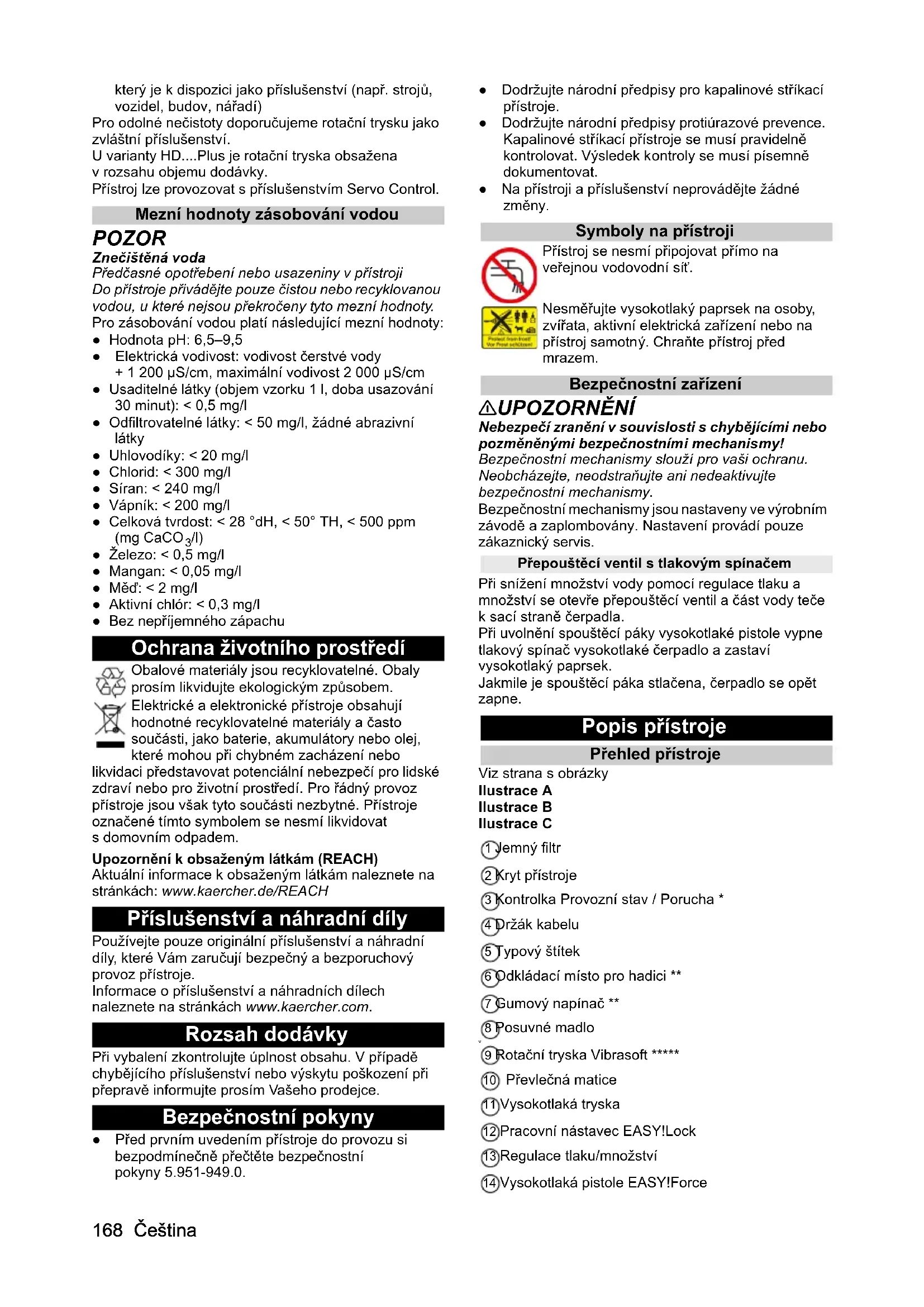 /l) ● Železo: < 0,5 mg/l ● Mangan: < 0,05 mg/l ● Měď: < 2 mg/l ● Aktivní chlór: < 0,3 mg/l ● Bez nepříjemného zápachu Ochrana životního prostředí Obalové materiály jsou recyklovatelné. Obaly prosím likvidujte ekologickým způsobem. Elektrické a elektronické přístroje obsahují hodnotné recyklovatelné materiály a často součásti, jako baterie, akumulátory nebo olej, které mohou při chybném zacházení nebo likvidaci představovat potenciální nebezpečí pro lidské zdraví nebo pro životní prostředí. Pro řádný provoz přístroje jsou však tyto součásti nezbytné. Přístroje označené tímto symbolem se nesmí likvidovat s domovním odpadem. Upozornění k obsaženým látkám (REACH) Aktuální informace k obsaženým látkám naleznete na stránkách: www.kaercher.de/REACH Příslušenství a náhradní díly Používejte pouze originální příslušenství a náhradní díly, které Vám zaručují bezpečný a bezporuchový provoz přístroje. Informace o příslušenství a náhradních dílech naleznete na stránkách www.kaercher.com. Rozsah dodávky Při vybalení zkontrolujte úplnost obsahu. V případě chybějícího příslušenství nebo výskytu poškození při přepravě informujte prosím Vašeho prodejce. Bezpečnostní pokyny ● Před prvním uvedením přístroje do provozu si bezpodmínečně přečtěte bezpečnostní pokyny 5.951-949.0. ● Dodržujte národní předpisy pro kapalinové stříkací přístroje. ● Dodržujte národní předpisy protiúrazové prevence. Kapalinové stříkací přístroje se musí pravidelně kontrolovat. Výsledek kontroly se musí písemně dokumentovat. ● Na přístroji a příslušenství neprovádějte žádné změny. Symboly na přístroji Přístroj se nesmí připojovat přímo na veřejnou vodovodní síť. Nesměřujte vysokotlaký paprsek na osoby, zvířata, aktivní elektrická zařízení nebo na přístroj samotný. Chraňte přístroj před mrazem. Bezpečnostní zařízení 몇 UPOZORNĚNÍ Nebezpečí zranění v souvislosti s chybějícími nebo pozměněnými bezpečnostními mechanismy! Bezpečnostní mechanismy slouží pro vaši ochranu. Neobcházejte, neodstraňujte ani nedeaktivujte bezpečnostní mechanismy. Bezpečnostní mechanismy jsou nastaveny ve výrobním závodě a zaplombovány. Nastavení provádí pouze zákaznický servis. Přepouštěcí ventil s tlakovým spínačem Při snížení množství vody pomocí regulace tlaku a množství se otevře přepouštěcí ventil a část vody teče k sací straně čerpadla. Při uvolnění spouštěcí páky vysokotlaké pistole vypne tlakový spínač vysokotlaké čerpadlo a zastaví vysokotlaký paprsek. Jakmile je spouštěcí páka stlačena, čerpadlo se opět zapne. Popis přístroje Přehled přístroje Viz strana s obrázky Ilustrace A Ilustrace B Ilustrace C 1 Jemný filtr 2 Kryt přístroje 3 Kontrolka Provozní stav / Porucha * 4 Držák kabelu 5 Typový štítek 6 Odkládací místo pro hadici ** 7 Gumový napínač ** 8 Posuvné madlo
